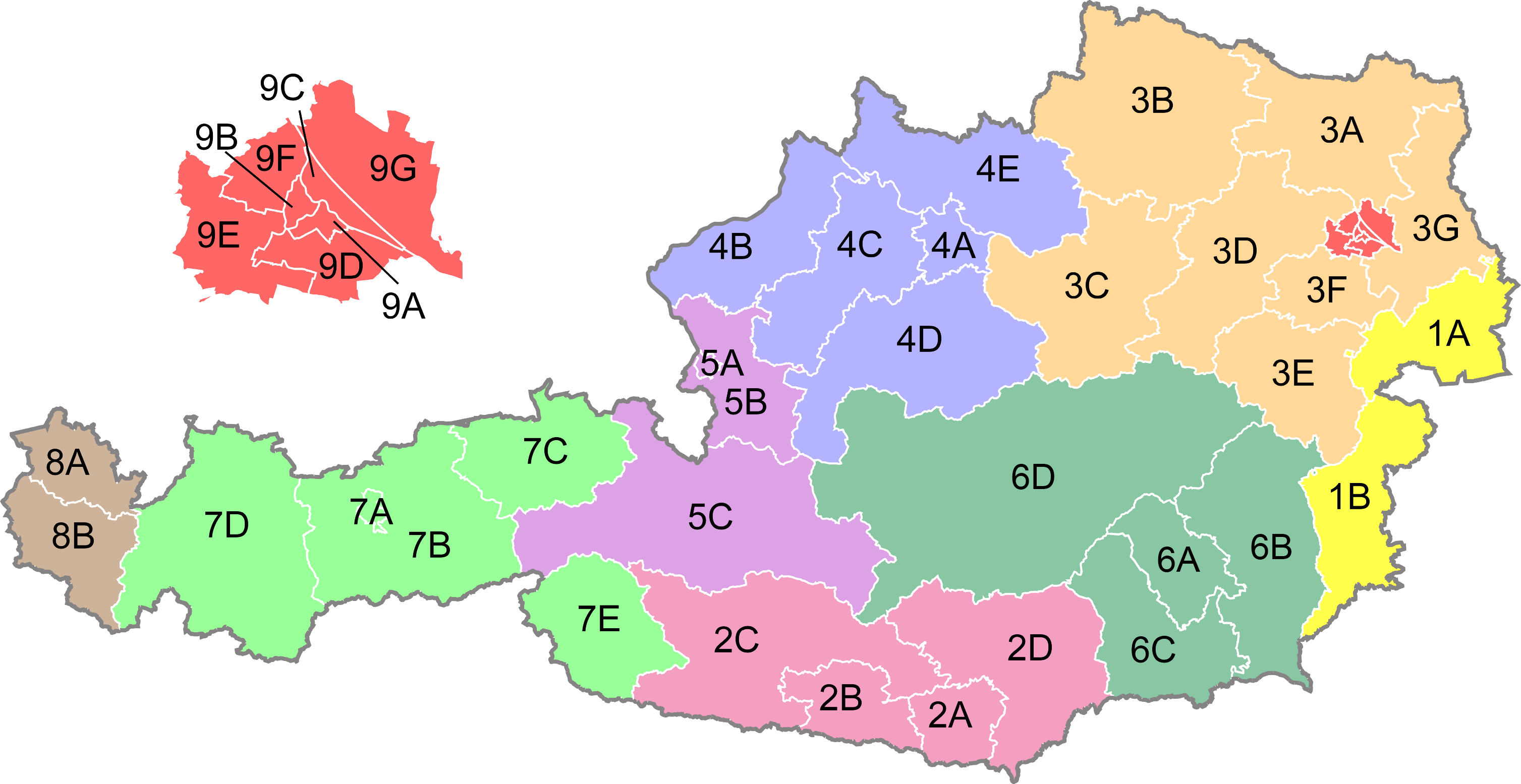 오스트리아는 네덜란드와 마찬가지로 모든 국회의원들을 비례대표제로 뽑는다. 전국을 9개 주(지역 선거구)와 39개 지방 선거구로 나누어 선거를 실시하며, 정당은 각 선거구별로 후보자 명부를 제출한다. 4% 이상의 득표율을 얻은 정당만이 의석을 배분받을 수 있으며, D'Hondt 방식(최대 잔여 방식)을 통해 의석이 할당된다.