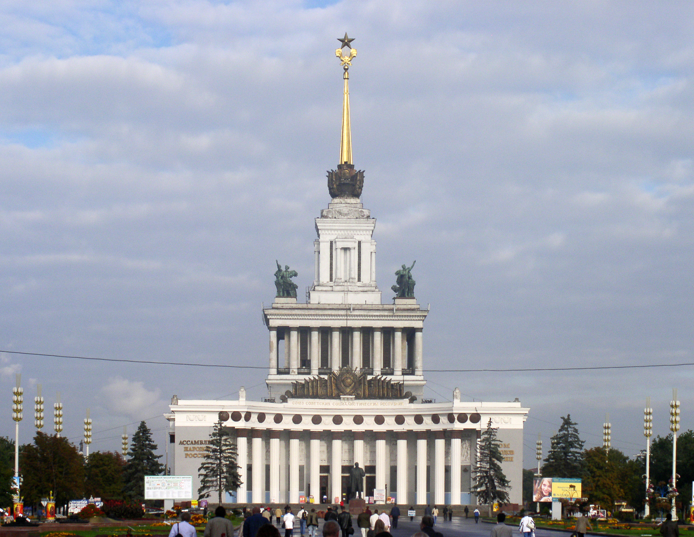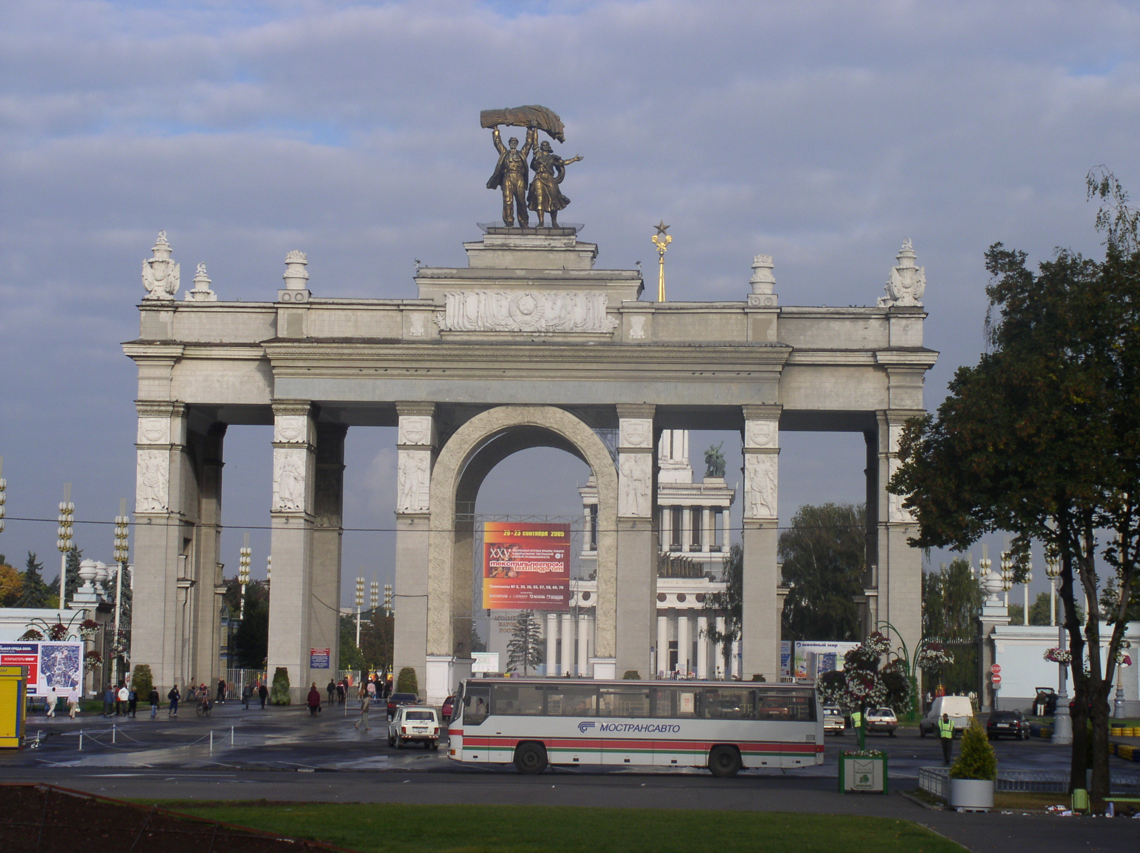 베라 무히나가 제작한 '노동자와 콜호즈 여성' 조각상은 박람회장의 상징적인 존재였다. 이 조각상은 1937년 파리 만국 박람회 소련관을 장식했던 것을 재현한 것이다.[1] 높이 25m의 스테인리스 조각상은 망치와 낫을 들고 있는 남녀의 모습을 표현하며, 러시아 최대 영화 스튜디오인 모스필름의 로고로 사용될 만큼 널리 알려져 있다.[1]