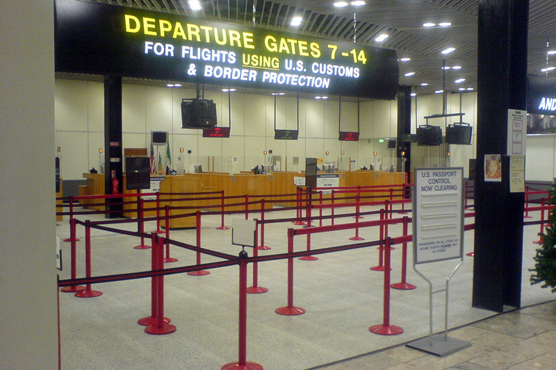 경우에 따라 여행객과 항공기는 출발 공항에서 목적지 국가의 세관 및 출입국 관리를 미리 통과할 수 있다. 대표적인 예로 캐나다와 아일랜드, 그리고 다른 여러 국가의 일부 공항에 설치된 미국 국경 사전 통과 시설이 있다. 이를 통해 해당 공항에서 출발하는 항공편은 세관 및 출입국 관리 시설이 없는 미국 내 공항으로도 운항할 수 있다.