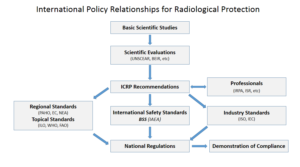 1956년 제네바에서 열린 회의는 ICRP가 ICR과 독립적으로 개최한 첫 공식 회의였다. 이 회의에서 ICRP는 세계 보건 기구(WHO)와 '참여 비정부 기구'로 공식 제휴를 맺었다.[15] 1959년에는 국제 원자력 기구(IAEA)와 공식적인 관계를 수립했으며, 이후 유엔 방사선 영향 과학 위원회(UNSCEAR), 국제 노동 기구(ILO), 식량 농업 기구(FAO), 국제 표준화 기구(ISO), 유네스코와도 관계를 맺었다.