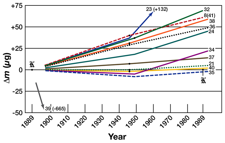 1988년에서 1992년 사이에 수행된 세 번째 주기적 검증 결과, 전 세계 원형들의 질량이 서로 분기하고 있으며, IPK가 지난 세기 동안 50 μg 정도의 질량을 잃었을 가능성이 제기되었다.[30][32] 이러한 질량 변화의 정확한 원인은 아직 밝혀지지 않았지만, 다음과 같은 요인들이 제기되었다.