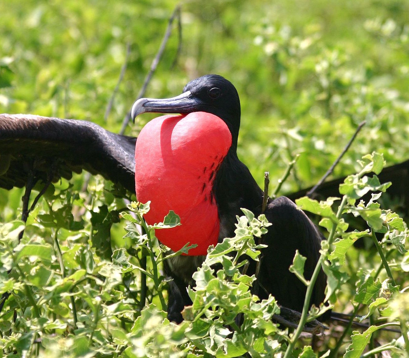 수컷 아메리카군함조(Fregata magnificens)가 갈라파고스 제도에서 목주머니를 부풀리며 구애하는 모습