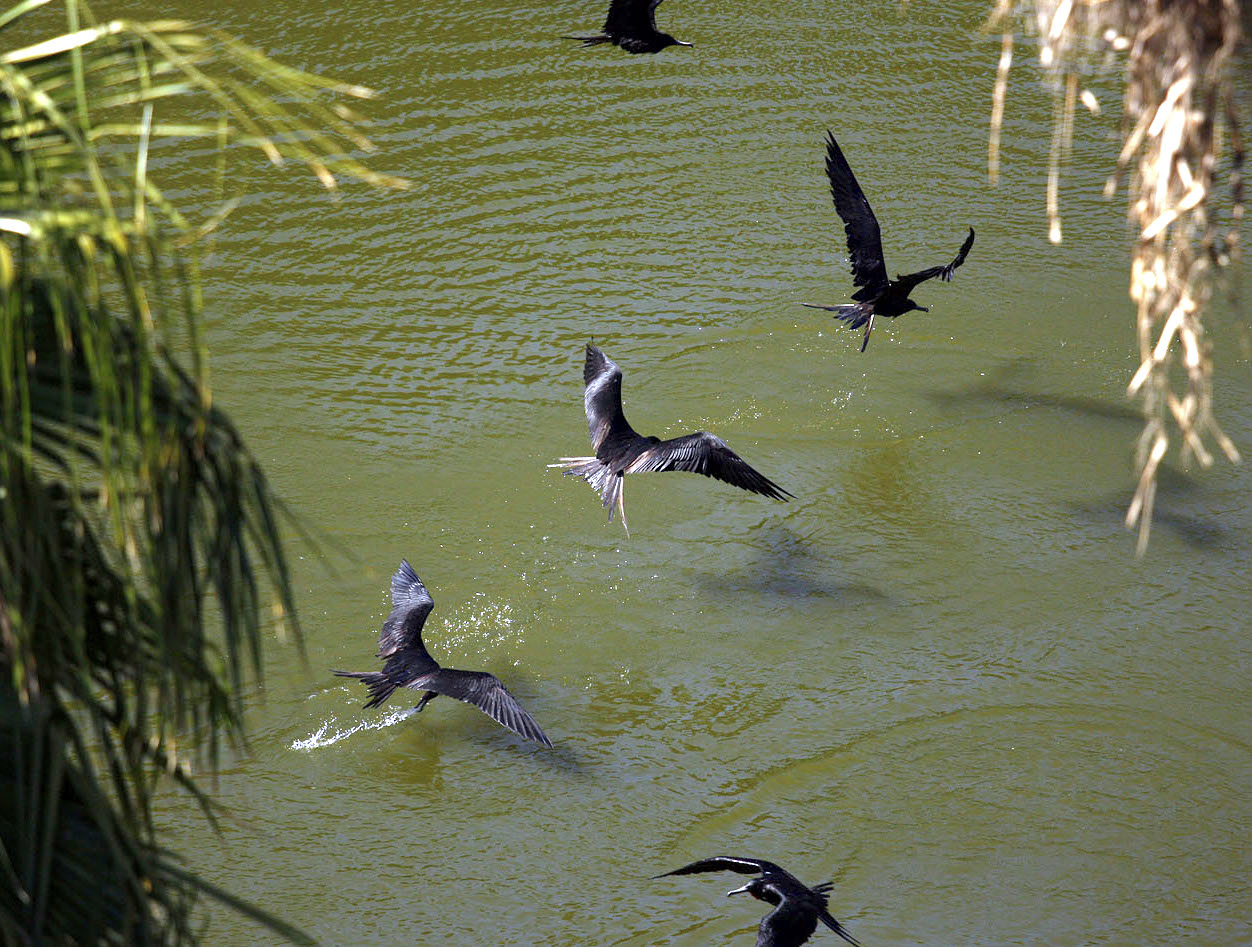 대부분의 다른 바닷새와 달리 군함조는 담수를 만나면 부리로 낚아채 삼켜 마신다.
