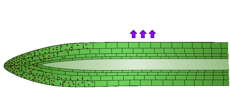 - 대안 모델은 국부 곡률에 비례하는 일종의 "펴짐 신호"를 가정한다. 팁 각도가 30°에 가까워지면 이 신호가 재방향으로 인한 굽힘 신호를 극복하여 펴짐이 발생한다.[19]
