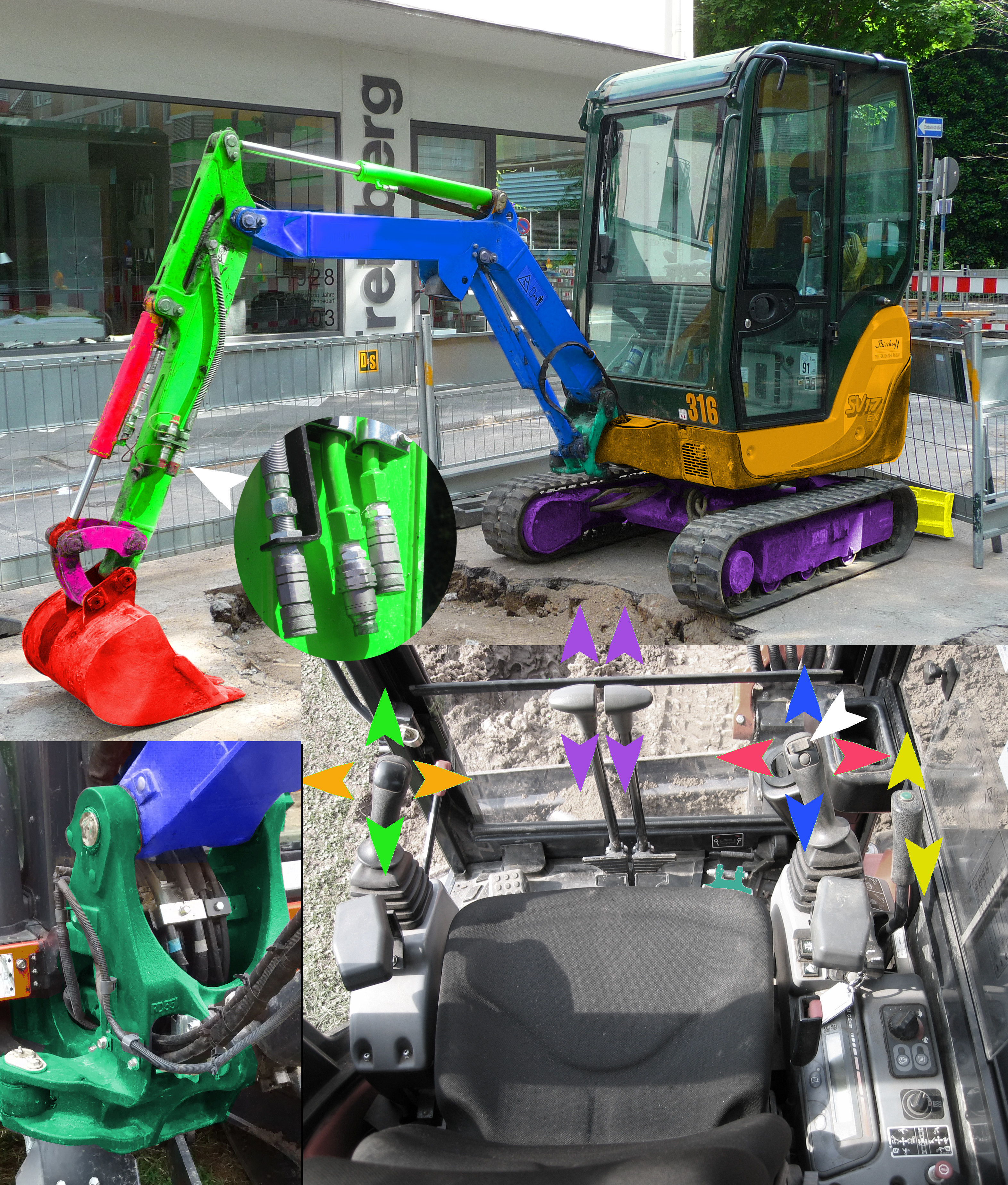 굴착기는 붐과 버킷 제어에 두 가지 주요 제어 구성을 사용하며, 네 가지 기본 기능을 두 개의 x-y 조이스틱에 분산한다. 숙련된 작업자는 네 기능을 동시에 제어할 수 있다. 미국에서는 SAE 컨트롤 구성이, 세계 다른 지역에서는 ISO 제어 구성이 일반적이다. 일부 제조업체는 제어 구성 선택 스위치를 제공한다.