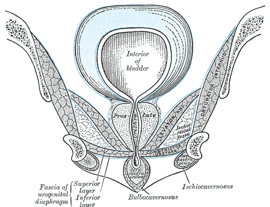 이 지점에서 일어난 근육 섬유는 널힘줄로 끝나며, 음경다리나 음핵다리의 측면과 아랫면에 닿는다.[4]