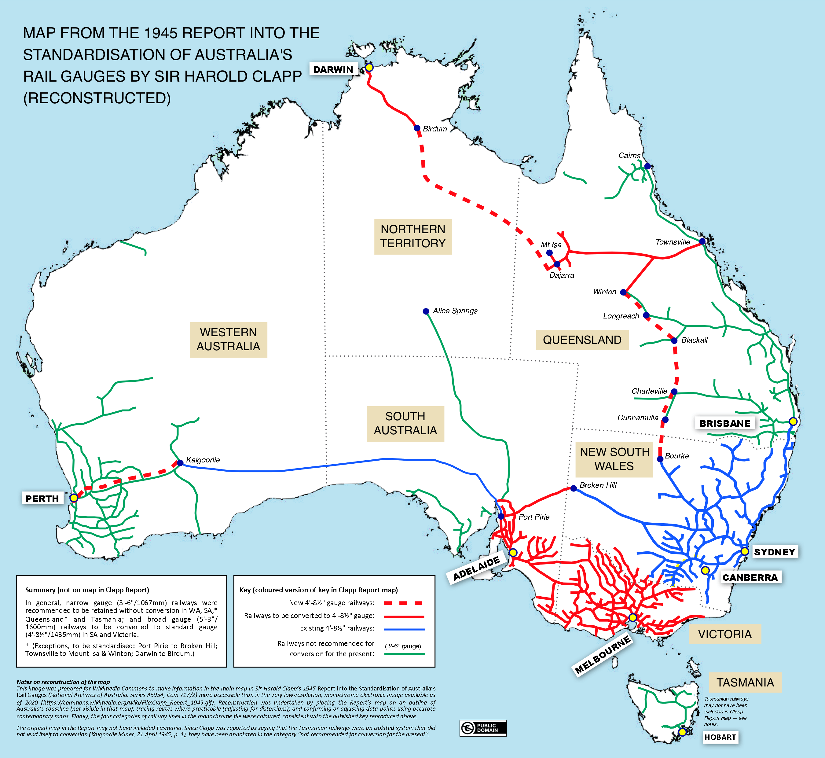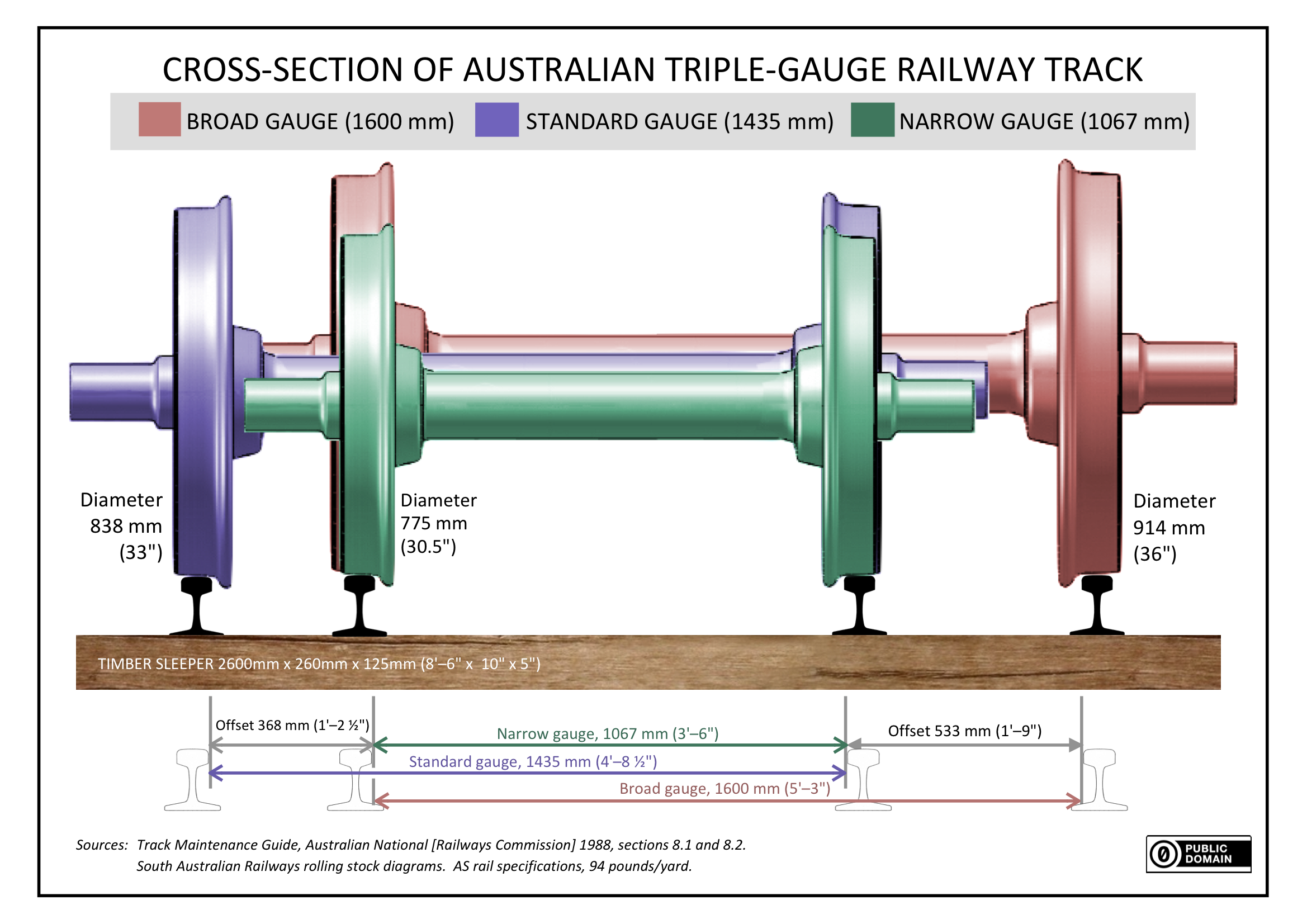 그러나 1850년, 뉴사우스웨일스는 또는 아일랜드 궤간으로 변경하기로 결정했다. 이 변경은 영국 정부의 승인을 받았고, 사우스오스트레일리아도 이를 따르기로 동의했다.[36] 하지만 1853년, 뉴사우스웨일스는 일방적으로 궤간으로 다시 변경했다. 사우스오스트레일리아와 뉴사우스웨일스로부터 분리된 빅토리아는 깨진 합의에 대해 항의했지만 소용없었다. 이미 광궤 레일, 기관차 및 철도 차량에 투자했기 때문에 건설을 계속했다.
