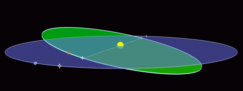 두 타원 궤도의 교점에 대한 애니메이션 (이미지를 클릭하세요.)