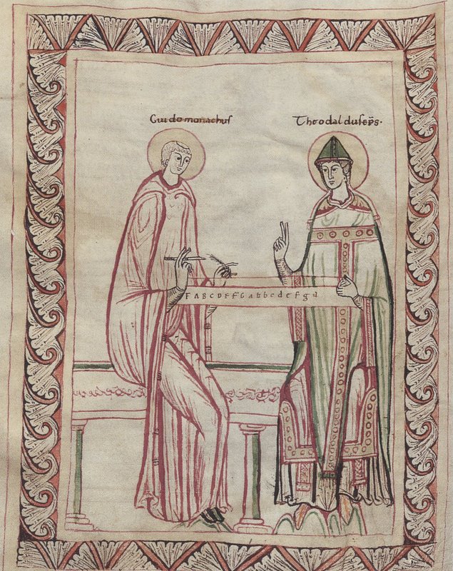 귀도 다레초는 프랑스에서 태어났을 것이라는 설이 있으며, 가톨릭교회의 수도회인 베네딕토회의 수도사였다.[16] 1020년경 폰포자(페라라 근교)의 베네딕트회 성마리아수도원에 들어가 음악이론을 배우고, 오늘날의 5선보와 원리가 거의 같은 4선(四線)을 사용한 새로운 기보법을 고안하여 《그레고리오성가집》을 기초하였다.