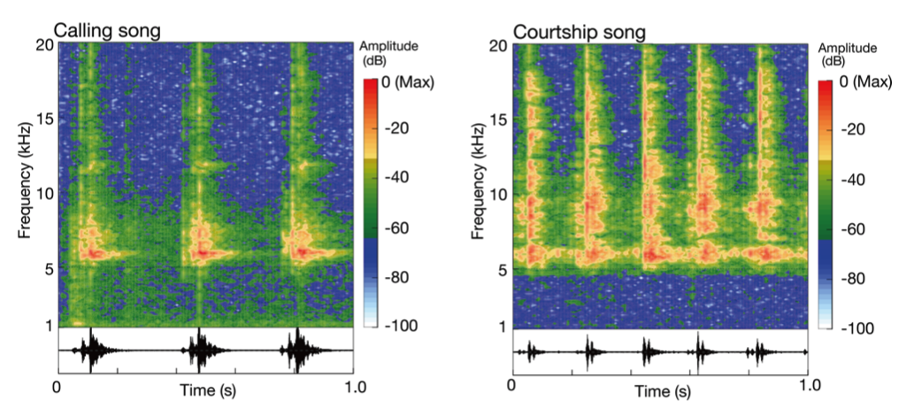 수컷 귀뚜라미는 날개를 비벼 울음소리를 내는데, 그 주파수는 4,000~5,000Hz이다.[25][32][26] 귀뚜라미의 귀(고막)는 앞다리 정강이에 있으며, 사람보다 넓은 주파수(수백Hz - 40kHz)의 소리를 구별할 수 있다.[27][32]