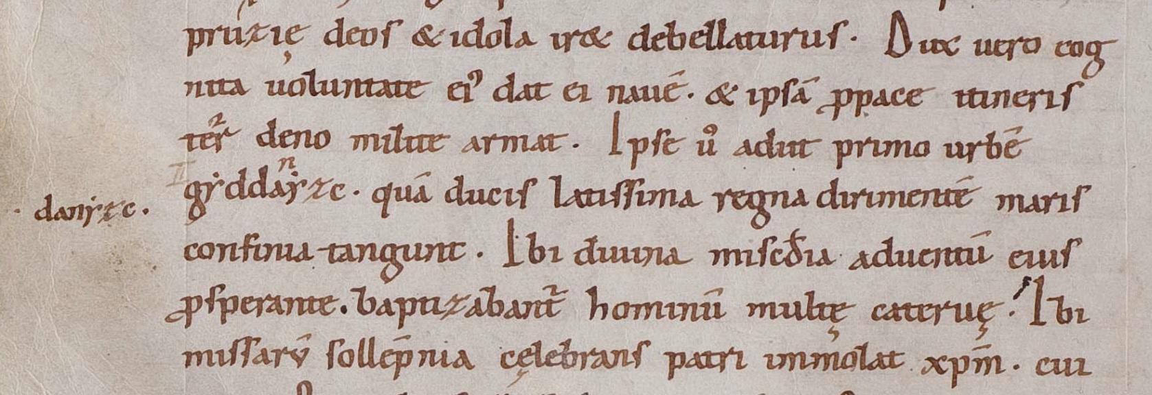 그단스크를 언급하는 것으로 여겨지는 최초의 기록은 마그데부르크의 아달베르트의 ''전기(vita)''이다. 999년에 쓰여진 이 기록은 997년 프라하의 아달베르트 성인이 "공작[즉, 폴란드의 볼레스와프 1세의 위대한 왕국을 바다와 구분하는] Gyddannyzc 도시"의 주민들에게 세례를 베푼 과정을 묘사하고 있다.[31]