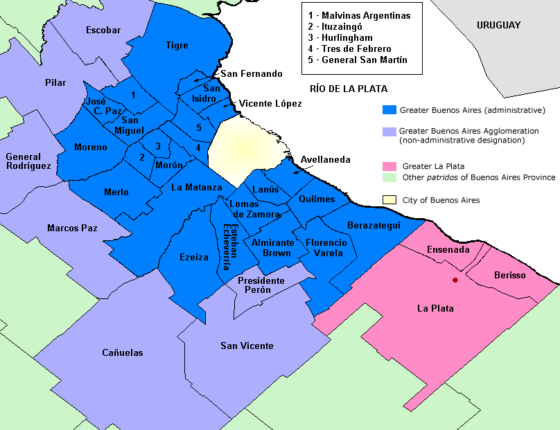 카뉴엘라스와 라플라타 지역은 독자적인 대도시권을 형성하고 있어서 그란부에노스아이레스에는 포함되지 않는다.[7]