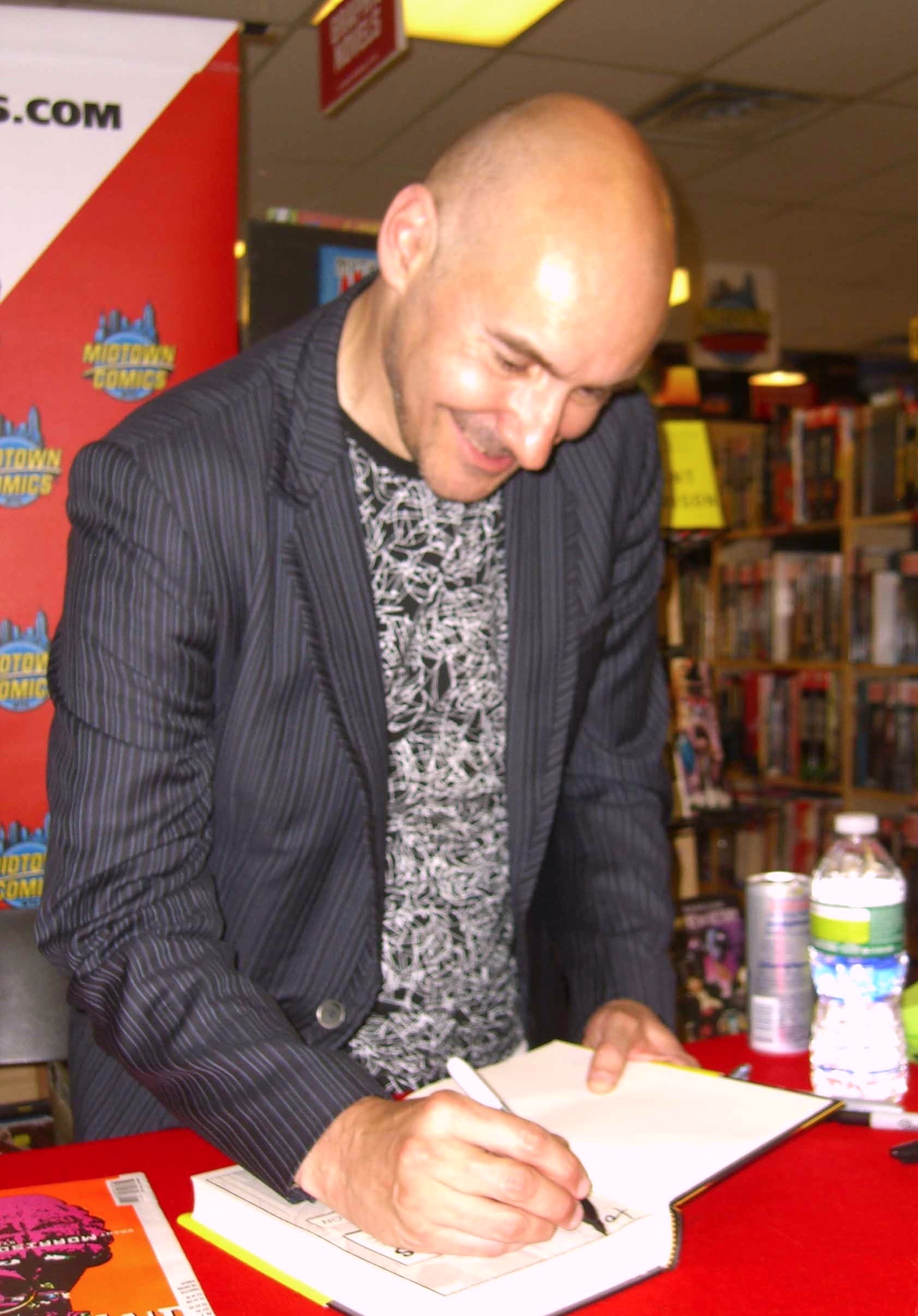 2011년 7월 19일 맨해튼 미드타운 코믹스에서 슈퍼히어로 분석서 ''슈퍼갓(Supergods)''에 서명하는 모리슨
