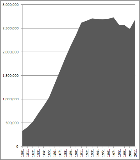 그레이터맨체스터의 인구는 1801년 328,609명에서 2011년 2,682,500명으로 증가했다.[263] 1974년 이전의 통계는 현재 그레이터맨체스터를 구성하는 지방 정부 지역에서 수집되었다.[112] 2021년에는 2,867,800명으로 더욱 증가했다.
