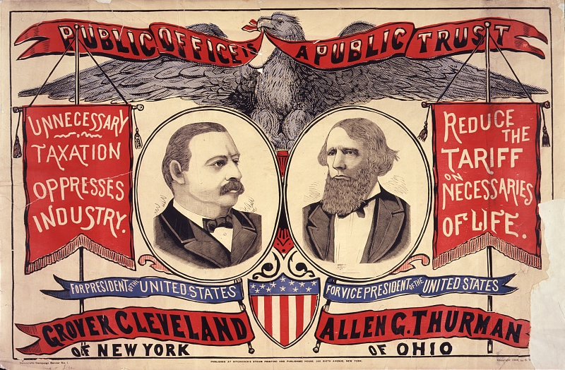 클리블랜드는 1884년 미국 대통령 선거에서 민주당 후보로 출마하여, 사생아 논란에도 불구하고 상대 후보 제임스 G. 블레인의 부패 의혹과 뉴욕에서의 근소한 차이로 승리하며 대통령에 당선되었다.[313][106]