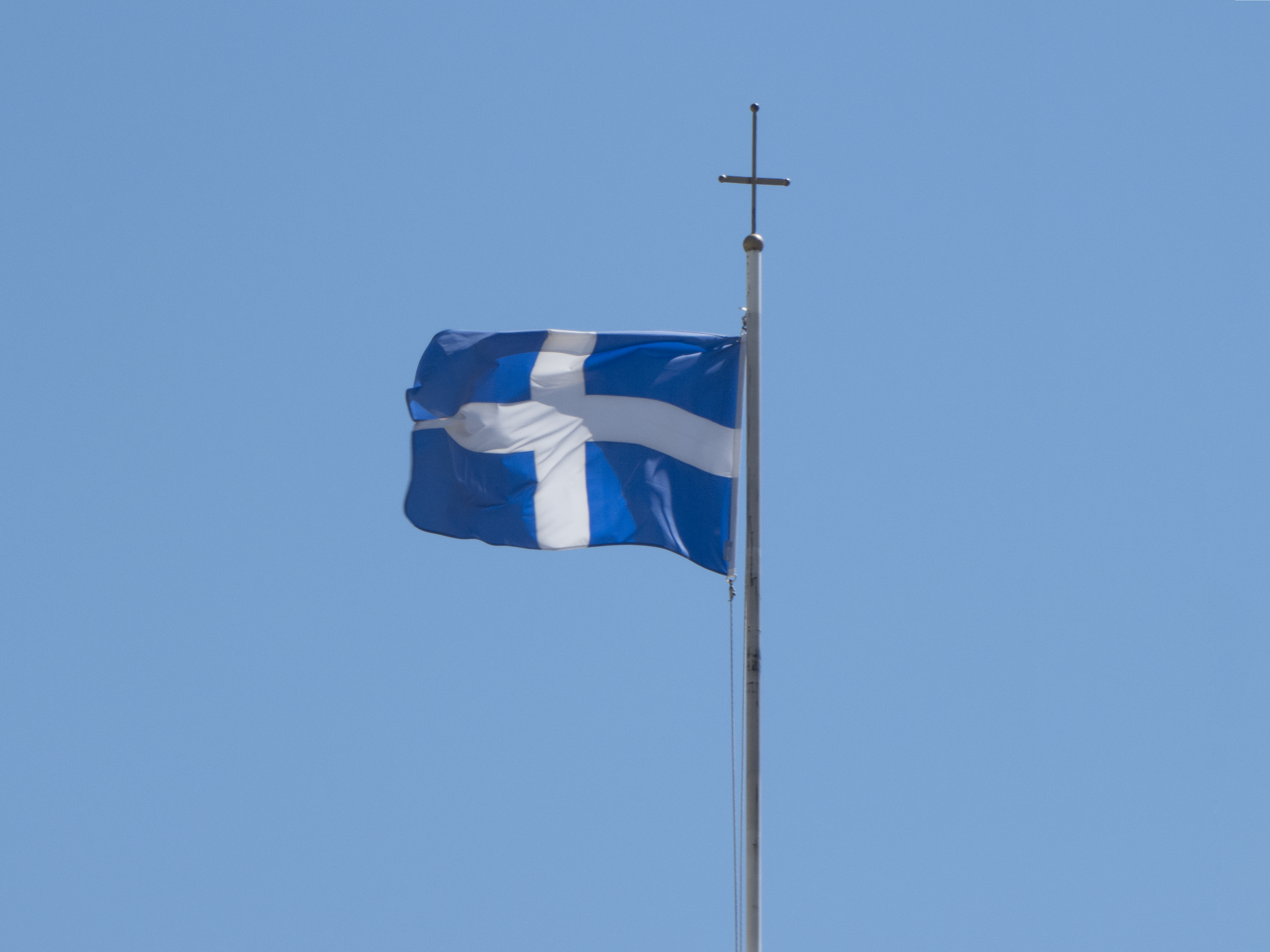 디자인 | 파란색과 흰색이 번갈아 나타나는 9개의 가로 줄무늬; 파란색 캔톤 전체에 흰색 그리스 십자가가 있음. |