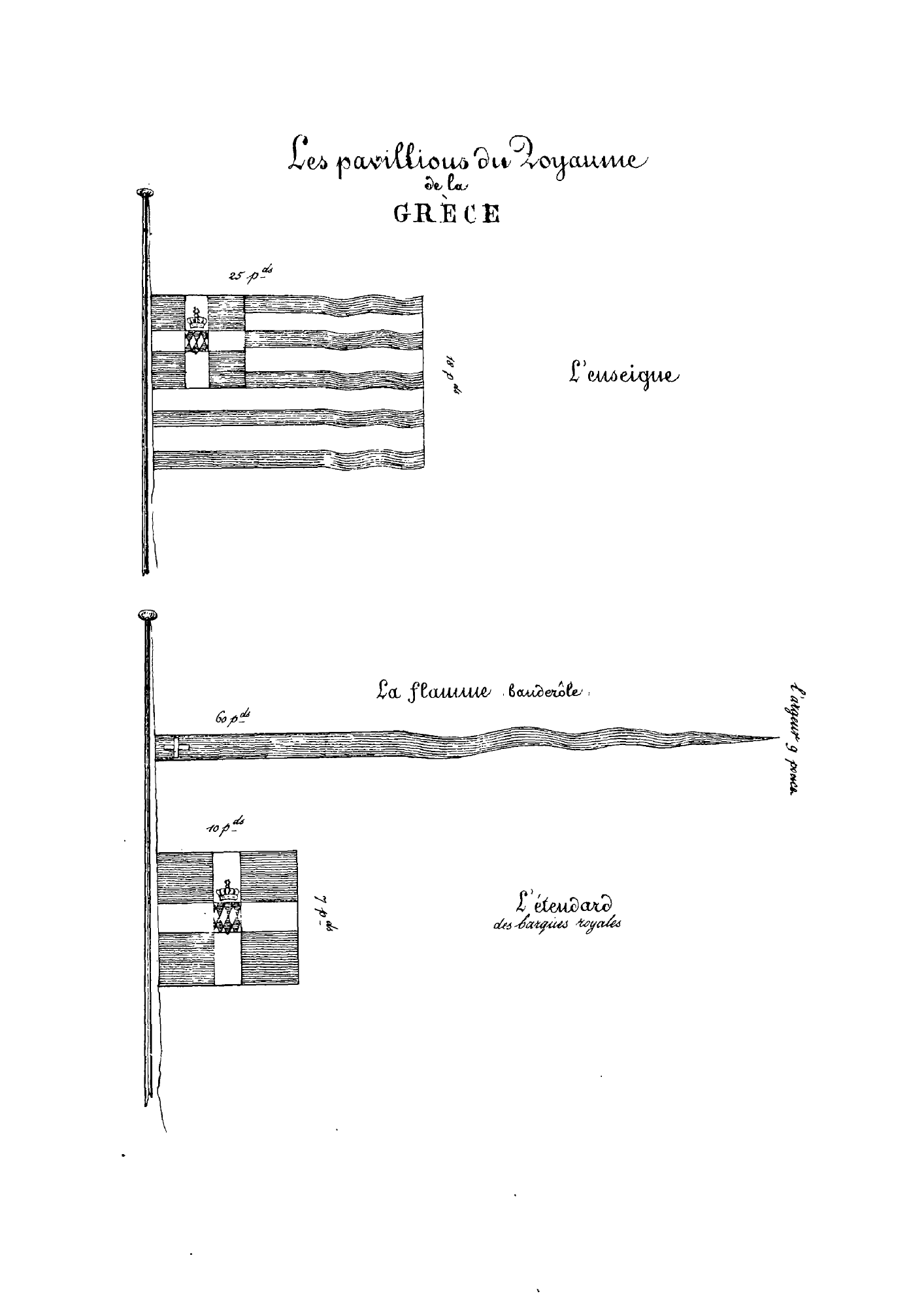 1832년 바이에른 출신 오토가 그리스 왕국을 세운 후, 국기 중앙에 왕실 문장 (자신의 조상인 바이에른 패턴 방패에 왕관을 얹은 것)이 추가되었다.[1] 1833년 4월 4일(16일) 법령에는 전쟁기 또는 해군 군기(18:25 비율), 페넌트, 왕실기(7:10 비율), 민간 군기(문장이 없는 해군 군기) 등이 규정되었다.[12] 1858년 8월 28일 왕실 칙령은 1833년 칙령 및 기타 기에 대한 구조 및 치수에 대한 세부 사항을 규정했다. 오토가 1862년에 퇴위한 후, 왕실 문장은 제거되었다.
