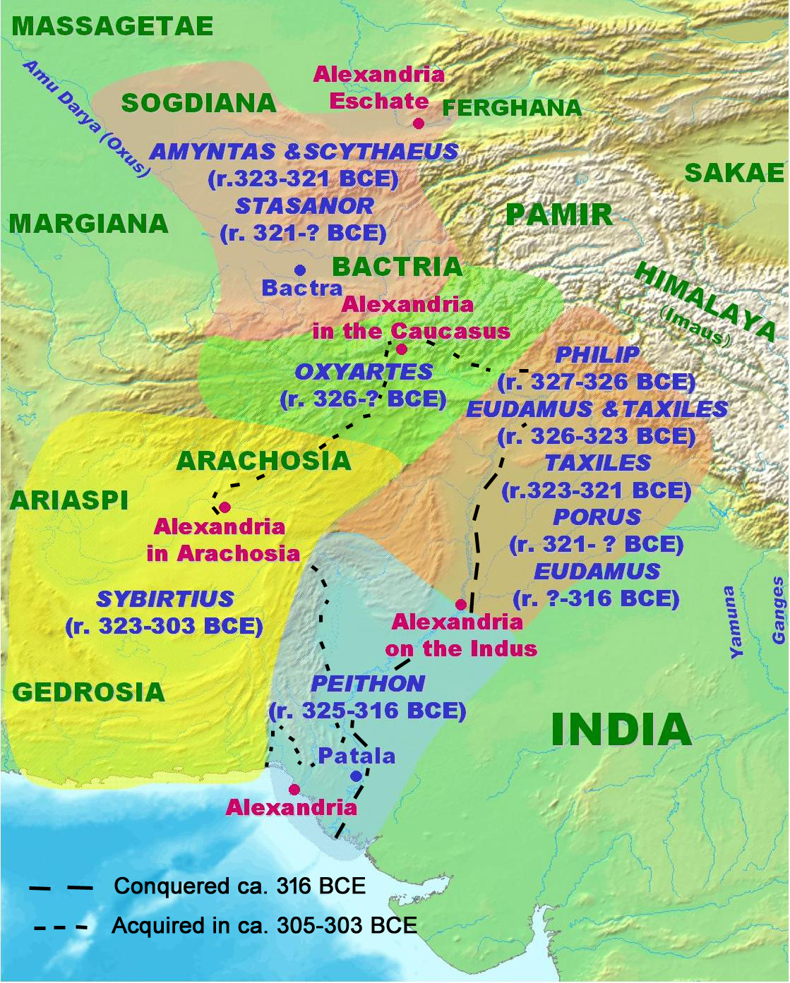 알렉산드로스는 탁실라에 그리스 군대를 남겨두었다. 에우데무스와 페이톤 같은 장군들이 기원전 316년경까지 이 지역을 통치했다. 소피테스(기원전 305–294)는 펀자브의 독립적인 인도 통치자였다.