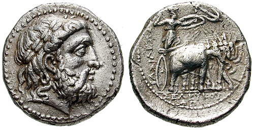 셀레우키아에서 제작된 셀레우코스 1세 니카토르의 테트라드라크마. 앞면: 제우스의 머리, 뒷면: 코끼리와 아테나
