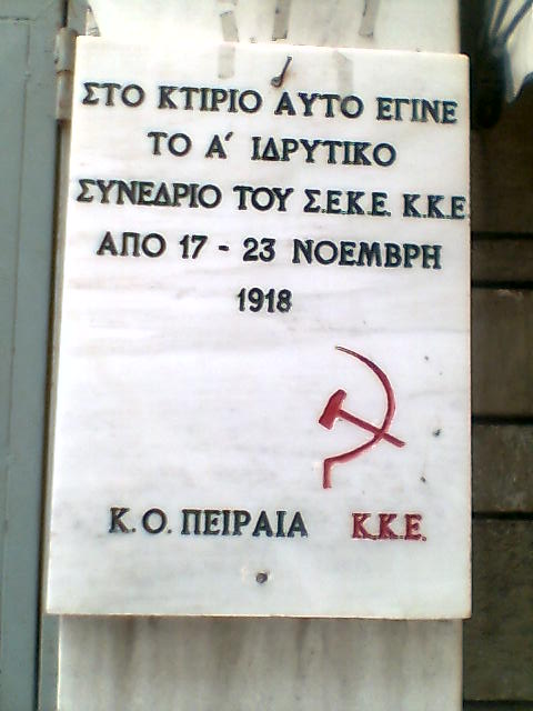 피레우스에 있는 당의 첫 번째 전당대회 및 창당 기념 명판