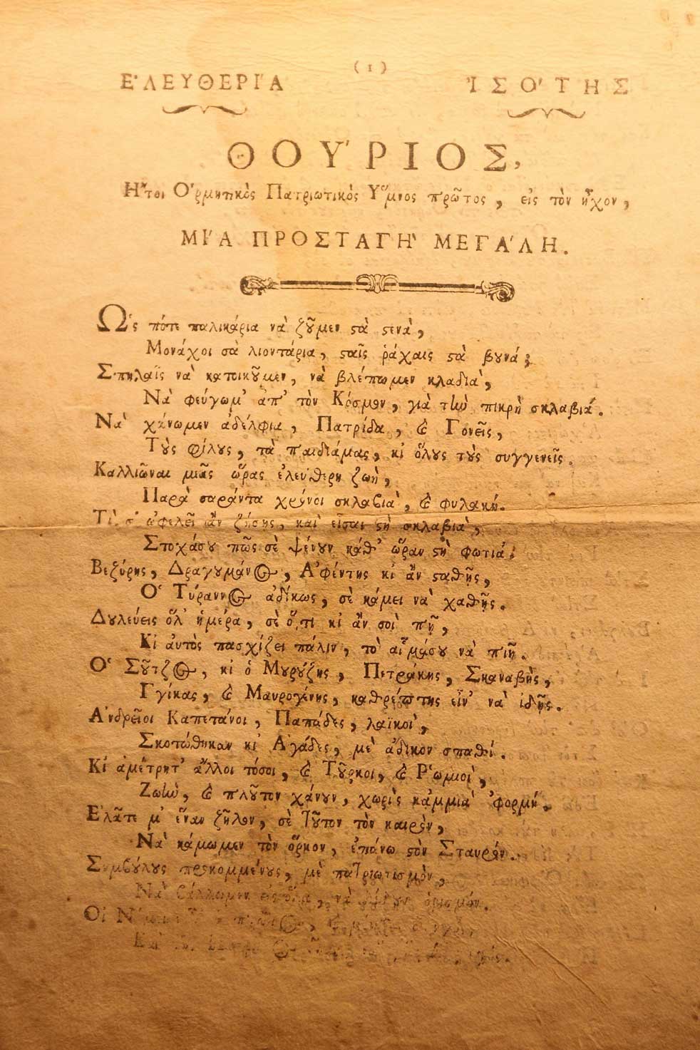 리가스 페라이오스의 민족주의 시 "투리오스"(전쟁 노래)는 여러 서유럽 언어와 발칸 반도 언어로 번역되어 오스만 지배에 맞선 그리스인들의 투쟁 구호가 되었다.[41]