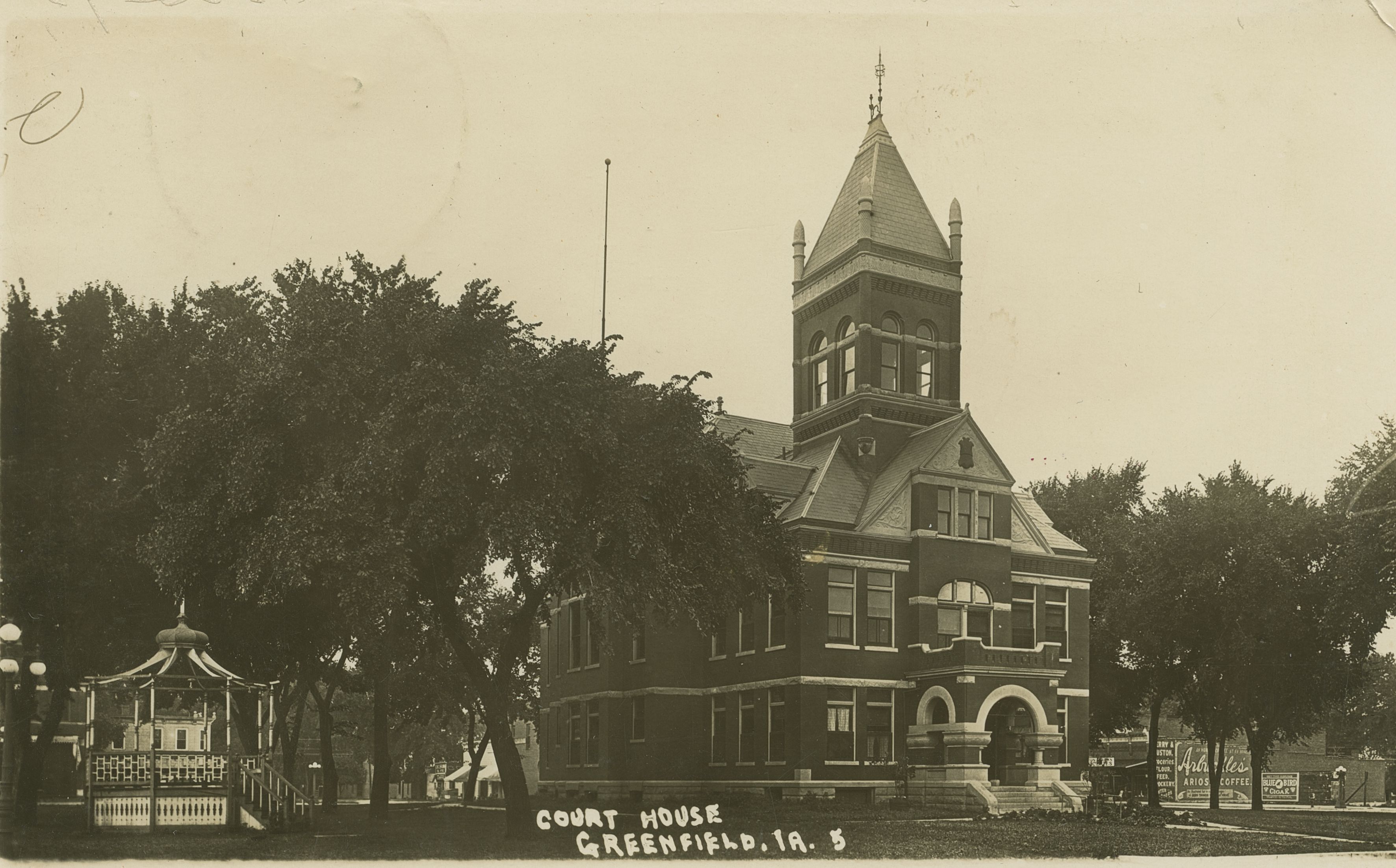 그린필드 주변 지역은 1854년에 정착되었다.[5] 1856년, 밀턴 C. 멍거가 그린필드가 건설될 부지를 매입하고 도시를 설계했다. 멍거는 그린필드 특유의 랭커스터 스타일 타운 광장을 설계했으며, 그랜트 가(Grant St.)와 NE 세컨드 스트리트(NE 2nd St.)에 위치한 시립 공원도 원래 부지 계획에 포함되어 있었다. 그린필드는 매사추세츠주 그린필드의 이름을 따서 지어졌다.[6]1875년, 그린필드는 인근 도시 폰타넬과의 경쟁에서 승리하여 애데어 카운티의 청사 소재지가 되었다.[7][8] 1876년 5월 22일에는 법인으로 설립되었다.[9]