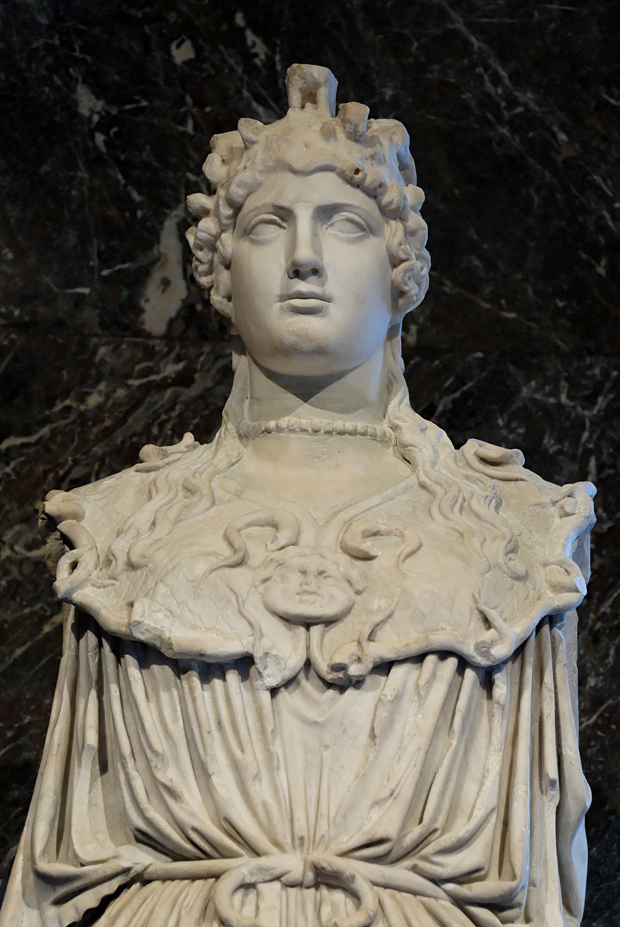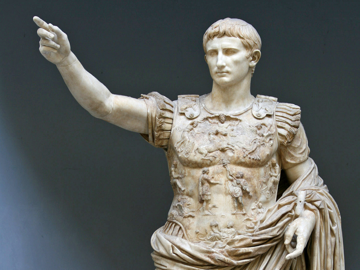 특히 유명한 프리마 포르타의 아우구스투스의 흉갑은 장식성이 매우 뛰어나다. 흉갑 가운데에는 로마 장교가 파르티아인으로 보이는 턱수염을 기른 야만인에게서 로마 군단기 (아퀼라)를 받는 장면이 묘사되어 있다. 이 로마 장교는 옆에 사냥개를 두고 있으며, 보통 젊은 티베리우스로 여겨진다. 이 장면은 일반적으로 기원전 53년 카르헤 전투에서 잃었던 군단기를 기원전 20년에 돌려받는 것을 나타낸다. 해부학적으로 사실적인 배꼽(그리스어 ''옴팔로스'', 라틴어 ''umbilicus'')은 가운데 두 인물 사이에 있고, 두 인물의 발을 기준으로 지면 높이보다 약간 아래, 복부 위에 자리 잡은 대지의 의인화 위에 놓여 있다.[33] 누워있는 자세, 풍요의 뿔, 젖을 먹는 아기들의 존재는 평화와 번영을 상징하며, 아우구스투스 시대 예술의 다른 여신들에게서 흔히 볼 수 있다. 그 외 흉갑의 부조에는 그리핀을 타며 리라를 연주하는 아폴론, 사슴 등에 타 있는 다이아나, 위쪽에 태양의 사두 마차 등이 있다.[34]