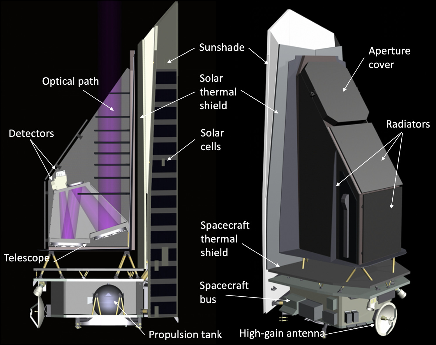 50cm 구경의 적외선 망원경을 탑재하고, 4µm에서 10µm 사이의 파장 범위에서 두 개의 열 적외선 채널로 관측을 수행한다.[1] 카메라는 NC1 (4–5.2 µm) 채널과 NC2 (6–10 µm) 채널을 갖는다. NC1 채널은 천체 측정 등록 및 보정, 유효 온도 측정을 위해 배경 별을 감지하며,[28] NC2 채널은 200-300K에서 일반적인 NEO 열 복사 감지에 최적화되어 있다.[28] 시야각은 11.56 제곱 도이다.[35]텔레다인 이미징 센서에서 수정한 천문 광역 적외선 이미저(HAWAII) 수은 카드뮴 텔루라이드 검출기의 버전을 사용하며,[36] 임무 프로토타입 검출기는 2013년 4월에 성공적으로 테스트되었다.[37][38] 검출기 배열은 2,048 × 2,048 픽셀이며 하루에 82기가비트의 데이터를 생성한다.[35] 극저온 유체 냉각 없이, 검출기는 방사 냉각을 통해 스피처 우주 망원경에서 입증된 기술을 사용하여 30K까지 수동 냉각된다.[35][36]