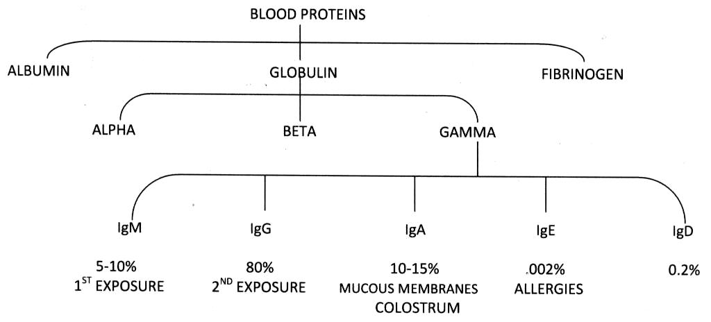 감마 글로불린은 주로 림프 조직에서 생성되며, 면역 체계의 핵심 구성 요소인 항체(면역글로불린)을 포함한다.[1] 면역학적으로 활성인 감마 글로불린은 면역글로불린 또는 항체라고도 불린다.[8]감마 글로불린에는 IgG, IgA, IgM, IgD, IgE 등이 있다.