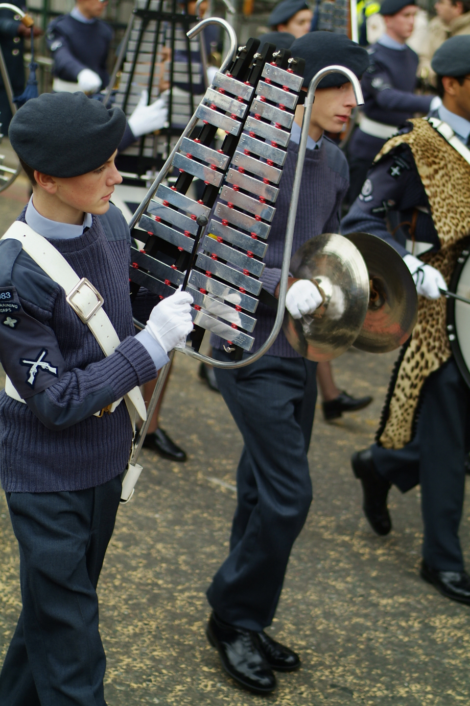 행진 또는 군악대에서 사용될 때는 금속판을 휴대용 케이스에 수직으로 장착하거나 리라 모양의 틀에 장착하기도 한다. 행진용 스네어 드럼과 유사한 장치를 사용하여 금속판을 수평으로 지지할 수도 있다. 오케스트라에서는 금속판을 수평으로 장착한다.[7]