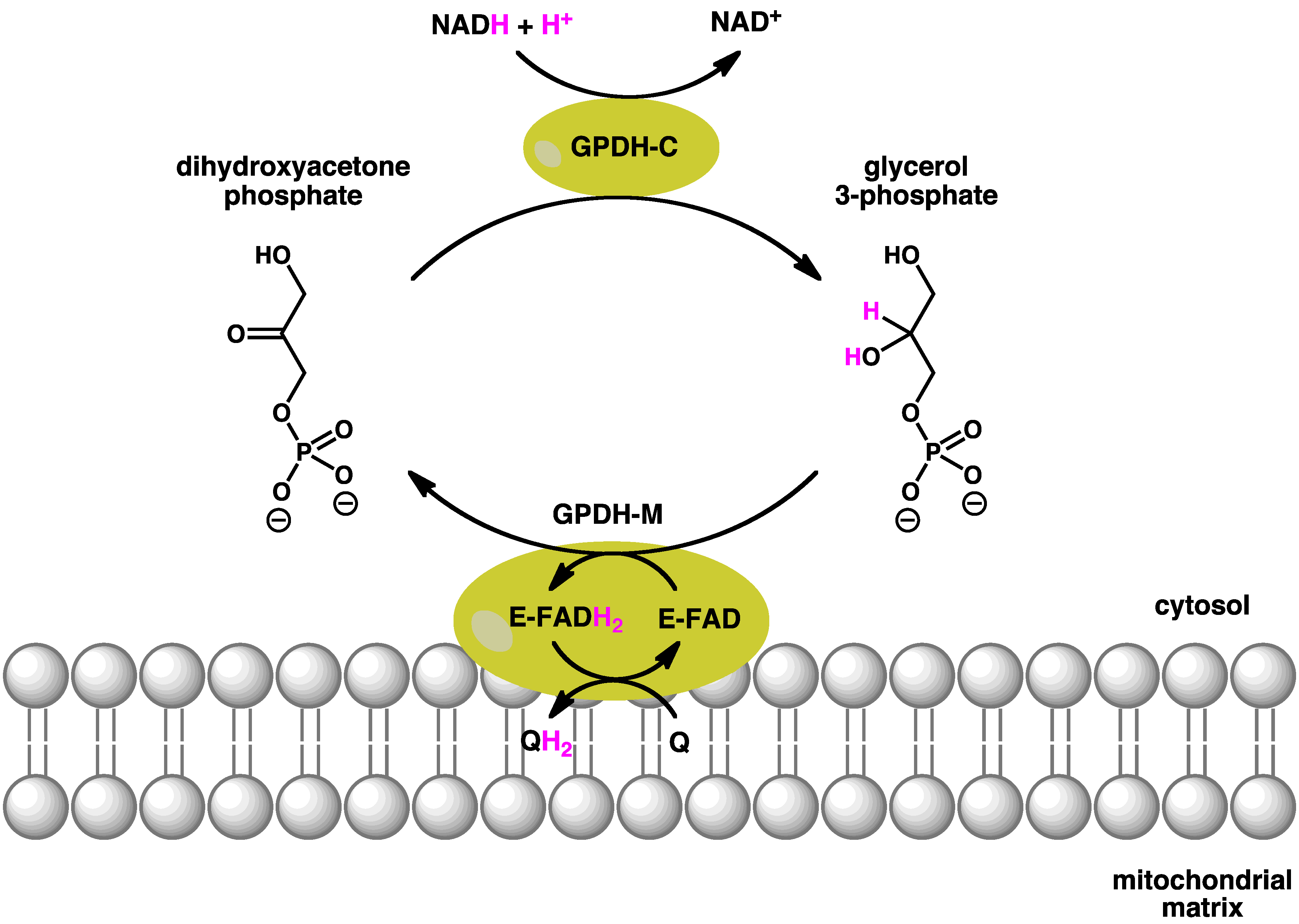 미토콘드리아의 글리세롤 3-인산 탈수소효소와 세포질의 글리세롤 3-인산 탈수소효소는 서로 협력하여 작동한다. 세포질의 글리세롤 3-인산 탈수소효소에 의해 NADH는 NAD+로 산화되고 다이하이드록시아세톤 인산이 글리세롤 3-인산으로 전환된다. 일단 글리세롤 3-인산이 미토콘드리아 내막을 통해 이동하면 퀴논을 산화제로 사용하고 FAD를 보조 인자로 사용하는 미토콘드리아의 글리세롤 3-인산 탈수소효소에 의해 다이하이드록시아세톤 인산으로 산화될 수 있다. 결과적으로 ATP 1분자에 필적하는 에너지의 순손실이 일어난다.[23]