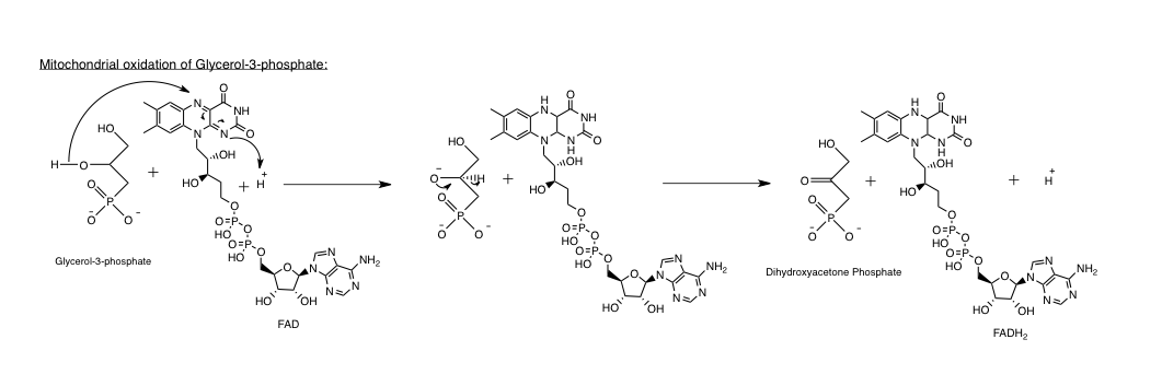 미토콘드리아의 글리세롤 3-인산 탈수소효소(GPD2)는 글리세롤 3-인산을 다이하이드록시아세톤 인산으로 비가역적으로 산화시키는 반응을 촉매하며, 동시에 2개의 전자를 FAD로 전달하여 FADH2를 생성한다.[26] GPD2는 4개의 동일한 소단위체로 구성된다.[26]