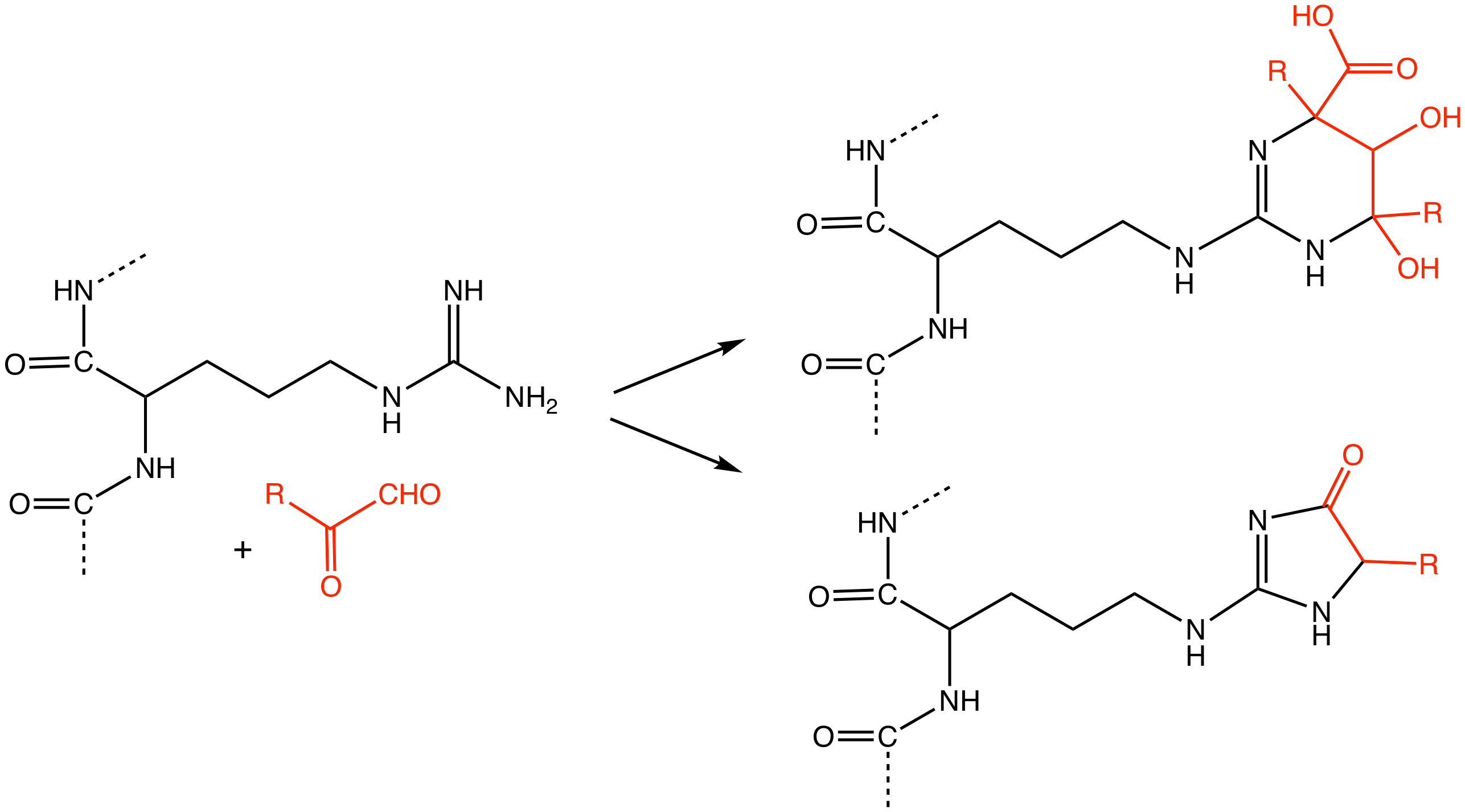 DNA 내의 구아닌 염기는 글리옥살에 의해 비효소적 당화를 겪어 글리옥살-구아닌 부가물을 형성할 수 있다.[12] 이러한 부가물은 이후 DNA 가교를 생성할 수 있다. DNA의 당화는 또한 돌연변이, DNA 절단 및 세포 독성을 유발할 수 있다.[13] 인간의 경우, 글리옥살 당화 뉴클레오티드는 Park7로도 알려진 단백질 DJ-1에 의해 복구될 수 있다.[4]