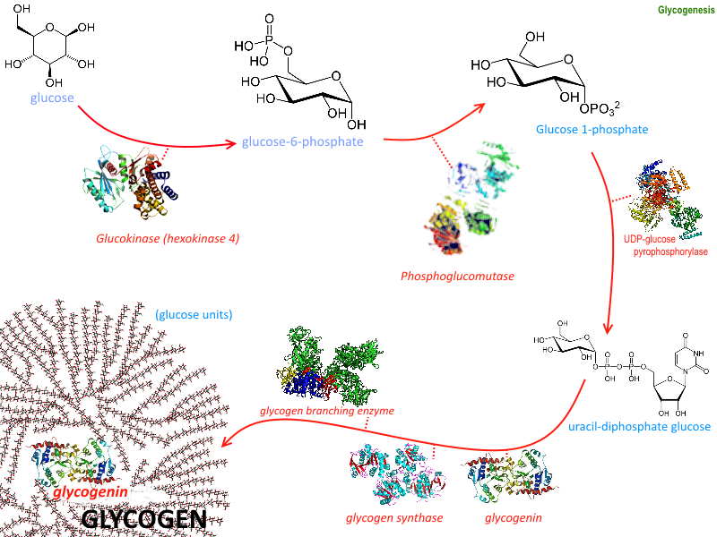 글리코제닌은 처음에 짧은 글리코젠 사슬을 만들기 위해 필요하며, 그런 다음 글리코젠 합성의 다른 효소들에 의해 사슬이 신장되고 새로운 가지 사슬이 형성된다.[1] 동종이량체인 글리코제닌은 각 소단위체에 티로신 잔기를 가지고 있어서 글리코젠의 환원 말단에 대한 앵커(anchor) 역할을 한다.[1] 처음에 약 8개의 UDP-포도당 분자가 글리코제닌에 의해 각 티로신 잔기에 순차적으로 첨가되어 α(1→4) 글리코사이드 결합을 형성한다.[1]2. 5. 글리코젠 생성효소에 의한 글리코젠 사슬 신장