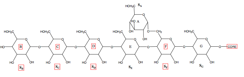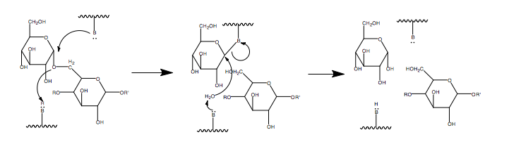 알파-1,6 결합 절단 메커니즘 아밀로-α-1,6-글루코시다제(amylo-α-1,6-glucosidase영어), 또는 글루코시다제는 남아있는 α-1,6 결합을 절단하여 포도당과 선형 글리코겐 사슬을 생성한다.[4] 글루코시다제가 α-1,6-결합을 절단하는 메커니즘은 활성 부위의 아미노산이 아직 확인되지 않아 완전히 알려지지 않았다. 이는 옥소카르베늄 이온 중간체와 포도당 내 구조 유지를 통해 두 단계의 산-염기 보조 유형 메커니즘을 거치는 것으로 생각된다.[23] 이것은 결합을 절단하는 일반적인 방법으로, 가수 분해 부위 아래의 산이 양성자를 제공하고, 위에 있는 염기가 물을 탈양성자화하여 친핵체 역할을 할 수 있다. 이러한 산과 염기는 효소의 활성 부위에 있는 아미노산 측쇄이다.[19]