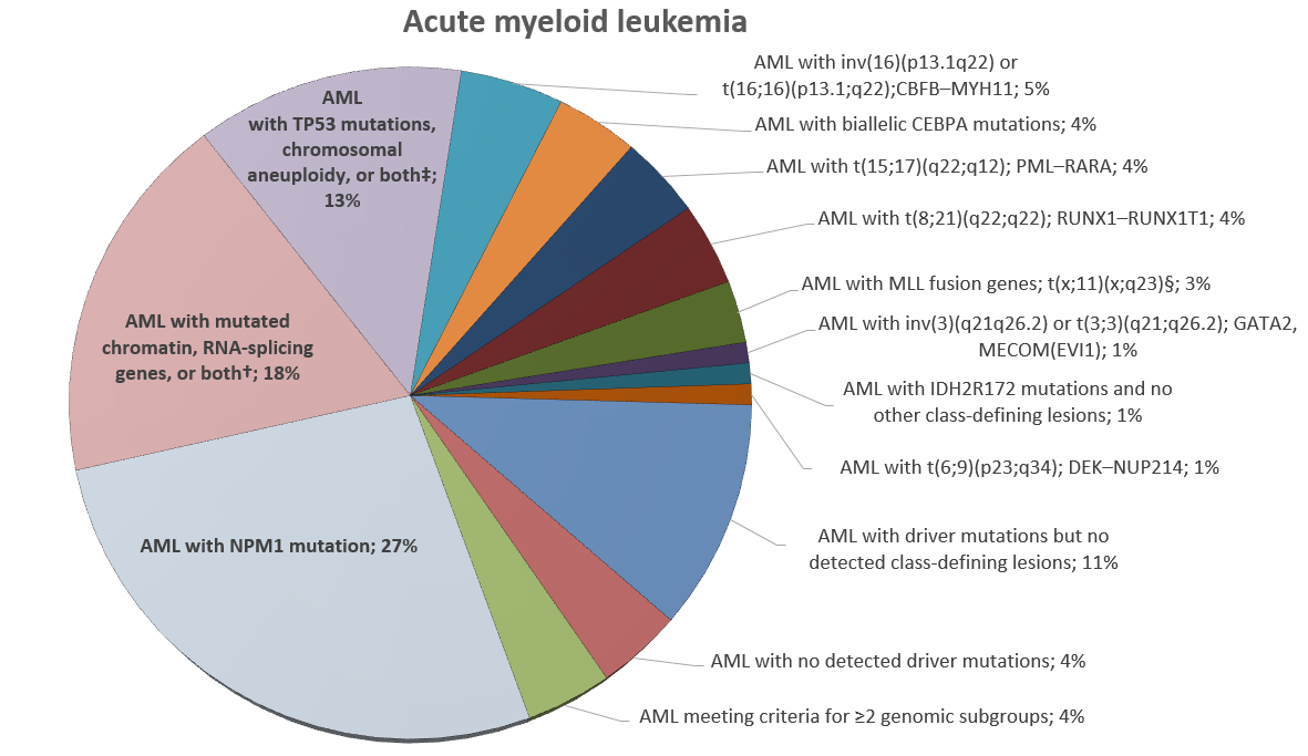특정 세포유전학적 이상은 AML 환자에게서 발견될 수 있으며, 염색체 이상 유형은 종종 예후와 관련이 있다.[15] 염색체 전위는 비정상적인 융합 단백질을 암호화하며, 일반적으로 변경된 특성이 "분화 정지"를 유발할 수 있는 전사 인자이다.[15] 예를 들어, 급성 전골수성 백혈병(APL)에서 t(15;17) 전위는 PML-RARA 융합 단백질을 생성하며, 이는 여러 골수 특이적 유전자의 프로모터에서 레티노산 수용체 요소에 결합하여 골수 분화를 억제한다.[15]