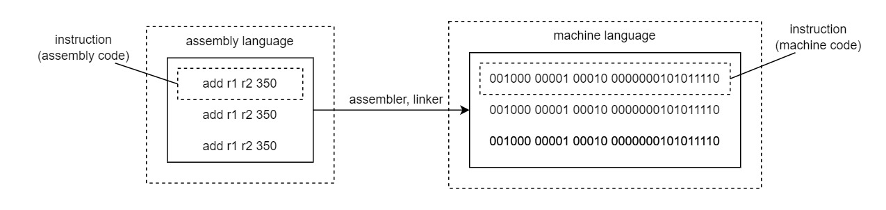 기계어는 0/1의 조합이나 16진수 표기이기 때문에 다루기 어려우므로, 대신 어셈블리어를 사용하는 것이 일반적이다. 어셈블리어는 프로그래밍 언어 중에서 기계어에 가장 가까우며, 기계어와 거의 1대 1로 대응하고, 인간이 이해하기 쉬운 니모닉으로 작성할 수 있다.