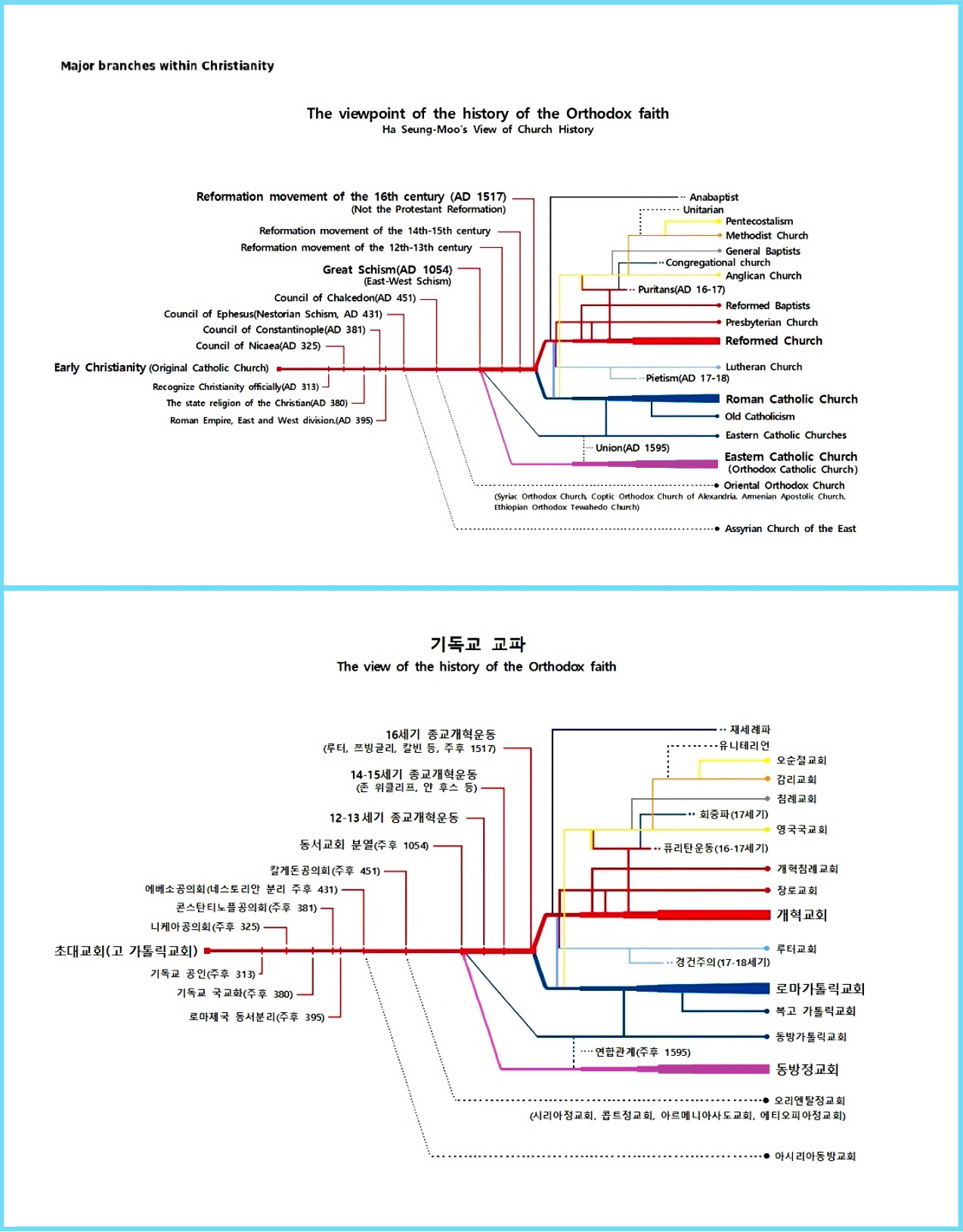 - '''서방교회''': 로마 가톨릭교회와 16세기 종교개혁 이후 발생한 개신교 (루터교, 침례교, 성공회, 감리교, 장로교, 개혁교회, 재림교, 성결교, 오순절교 등)