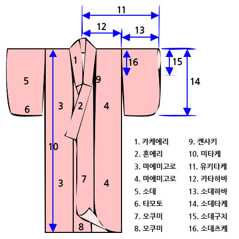 마에미고로 | 前身頃|Maemigoro일본어 | 기모노의 앞판 (오쿠미 제외). 좌우로 나뉜다. |