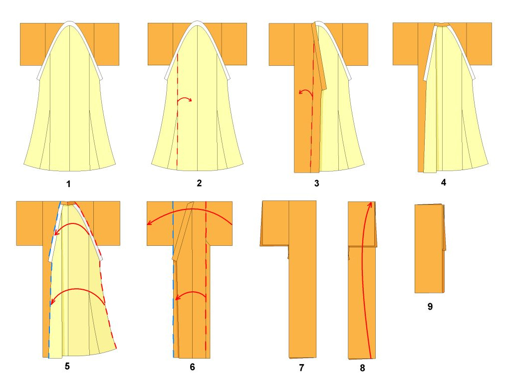기모노는 5세기부터 일본에 전해져 온 전통 의상으로, 중국의 영향을 받아 발전했다. 헤이안 시대에 양식화되어 화려해졌으며, 무로마치 시대에는 소매가 좁은 고소데가 일상복으로 사용되었다. 에도 시대에는 가부키와 같은 서민 문화의 발달과 함께 유행이 생겨났으며, 메이지 시대 이후 서양 의복의 보급으로 격식을 갖춘 차림은 유카타로 대체되었다. 기모노는 제작 방식, 격식, 종류에 따라 다양한 형태로 존재하며, 여성용은 나이와 결혼 여부에 따라, 남성용은 주로 옷감과 문양으로 격식을 나타낸다. 최근에는 중고 기모노나 서양식 의복과의 혼합 등 다양한 형태로 변화하고 있다.