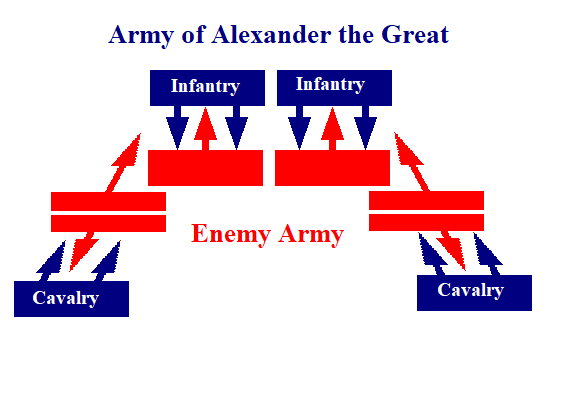 알렉산드로스 대왕이 처음으로 완성된 마케도니아식 망치와 모루 전술을 선보인 전투는 이소스 전투이다. 이 전투에서 알렉산드로스 대왕의 마케도니아군은 수적으로 열세임에도 페르시아를 격파하였다. 알렉산드로스 대왕의 마케도니아 군과 다리우스 3세의 페르시아 군은 이소스 평원에서 일렬로 마주보는 형태로 대치하게 되었다. 마케도니아 군의 보병부대가 페르시아 군을 정면에서 상대하면서 전투가 시작되었다. 전투가 시작되고 양 측이 격돌하기 시작하면 양익의 마케도니아 군의 기병대가 적 제대를 우회기동한다. 그리고 그림(망치와 모루)과 같이 적의 측후방을 공격했다. 기병대 특유의 기동력과 충격력으로 적의 배후를 잡아 적의 진형을 와해시키는 전술인 것이다.