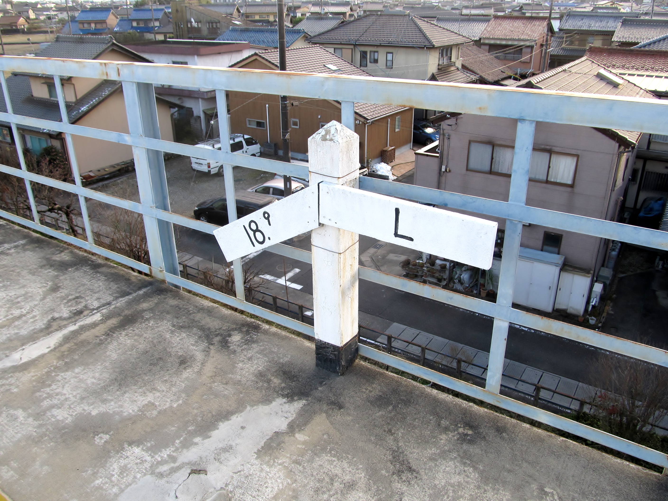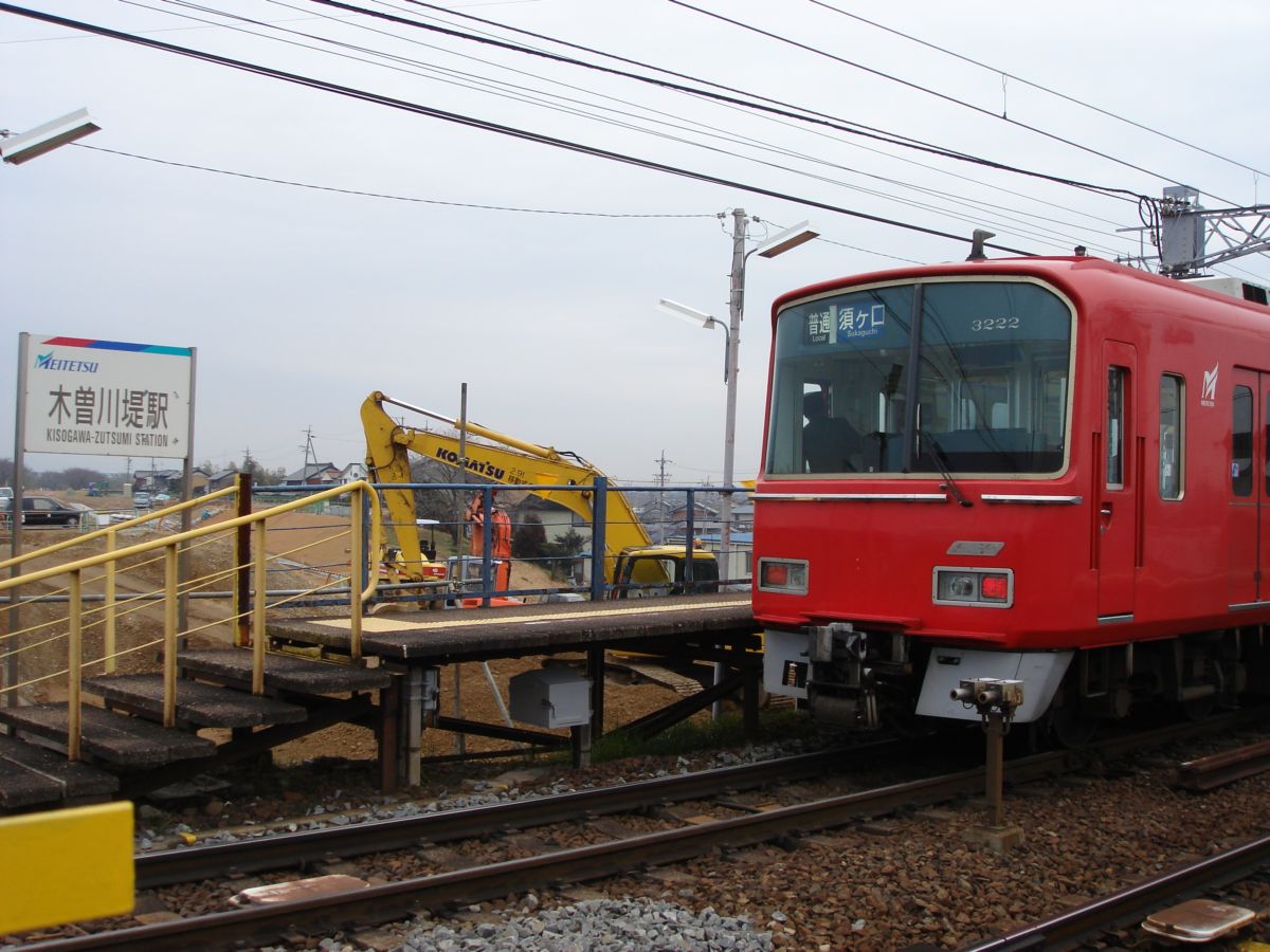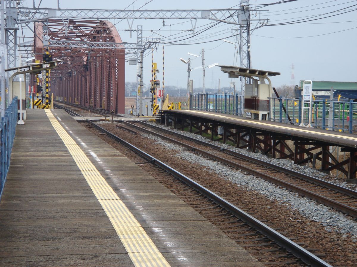 역 주변 선로는 제방 경사로 인해 승강장도 비스듬하게 설치되어 있다. 역 바로 기후 방면에는 제방 도로가 있으며, 이를 지나면 메이테쓰에서 가장 긴 기소강 교량을 건너게 된다. 기후행 통과 열차는 역 남쪽의 커브에서 감속한 후 역을 통과한다.