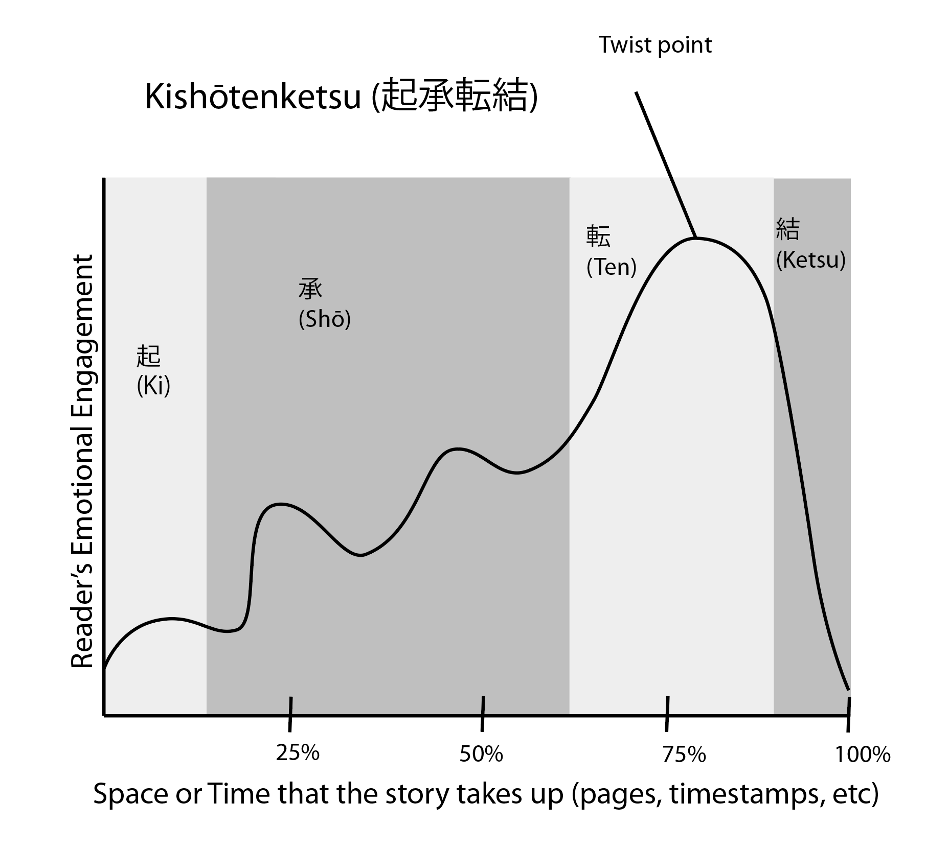 - 転|ten일본어: 이야기가 예상치 못한 방향으로 전환된다. 이야기의 핵심인 ヤマ|yama일본어(절정)이다. 여러 번 전환되면 가장 큰 전환점이다.