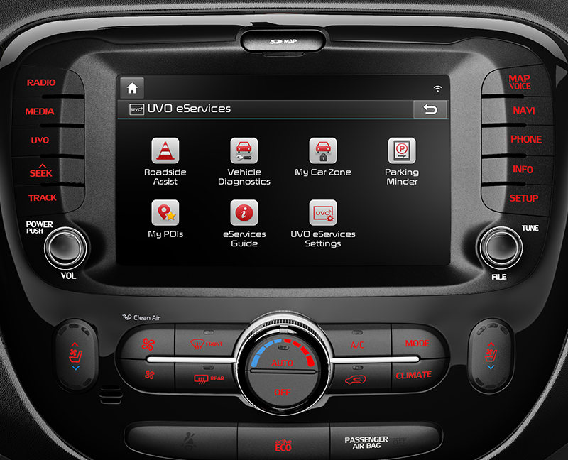 2014년형 쏘울에 8인치 내비게이션이 탑재된 UVO eServices가 처음 도입되었다. 이 시스템은 7인치 내비게이션이 탑재된 UVO eServices의 모든 기능을 갖추고 있으며, 더 큰 화면은 스와이프 제스처를 지원하고, 태블릿에서 앱이 구성되는 방식과 유사하게 기능이 구성되어 있다.2014년 9월 22일, 2014년형 쏘울 UVO 내비게이션 시스템 업데이트가 출시되어 My Car Zone, 차량 진단, 911 연결을 포함한 eServices가 활성화되었다.[5] 또한, 업데이트된 지도와 향상된 내비게이션 기능, 그리고 Siri Eyes-Free가 포함되었다.