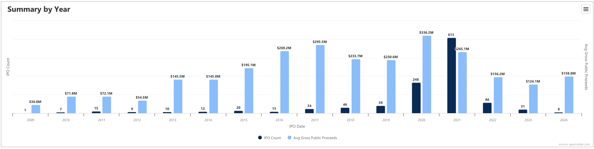 SPAC IPO는 2009년 이후 급격한 변동을 겪었으며, 2021년에 최고치인 1625.3억달러가 모금되었다.