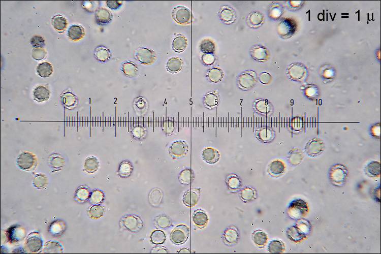 포자문은 옅은 크림색을 띤다. 담자포자는 크기가 7 - 8 × 6 - 6.5μm인 거의 구형에서 넓은 타원형을 이루며, 그 표면에는 미세한 가시 모양 돌기가 불규칙하게 생겨 있으며, 돌기의 기부는 매우 가는 연결사로 연결되어 있다. 갓의 표면에는 원추형의 시스티디아가 산재하며, 표피의 젤라틴화는 거의 인정되지 않는다.