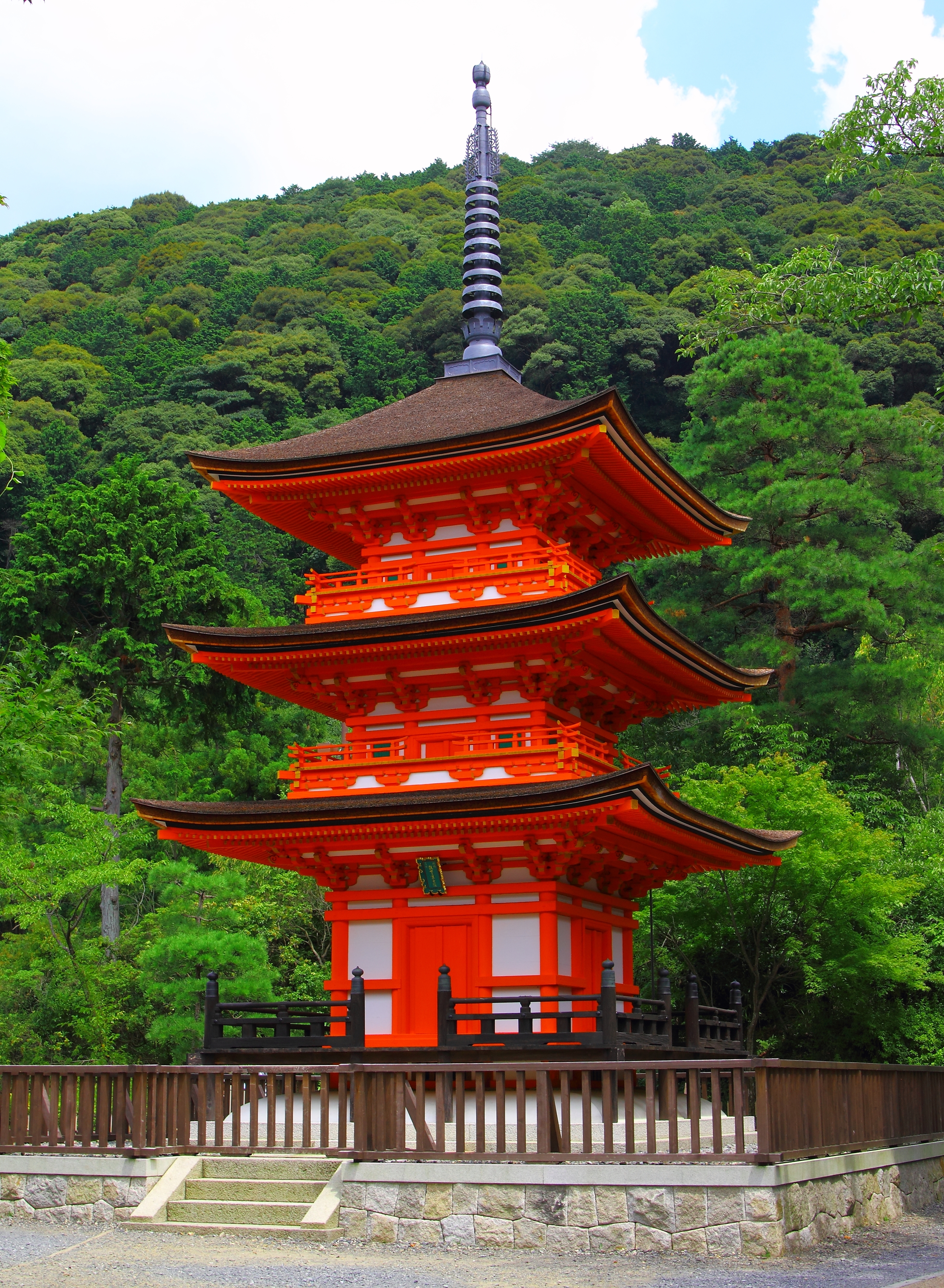 일본의 국보로, 1633년 도쿠가와 이에미쓰의 기부로 재건되었다. "기요미즈의 무대"로 불린다. 요세무네즈쿠리(寄棟造, 우진각 지붕) 양식, 히와다부키(檜皮葺, 노송나무 껍질 지붕)로 되어 있다. 산비탈에 돌출된 무대를 139개의 느티나무 기둥이 지탱하며, 못을 사용하지 않고 건축되었다.[21]