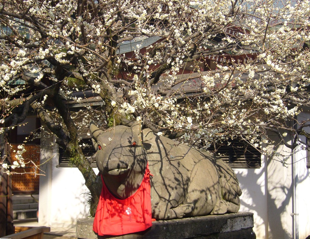 경내에는 앉은 자세의 와우상(臥牛像)이 많이 봉납되어 있는데, 이는 미치자네의 유해를 운반하던 소가 앉아 움직이지 않게 되어 그곳을 묘소로 매장했다는 『기타노 덴진 연기 그림 두루마리』의 고사에서 비롯된 것이다.[24][26] 본전 정면에는 경내에서 유일하게 서 있는 소의 상이 있으며, "유일한 입상"이라고 불린다.[26]