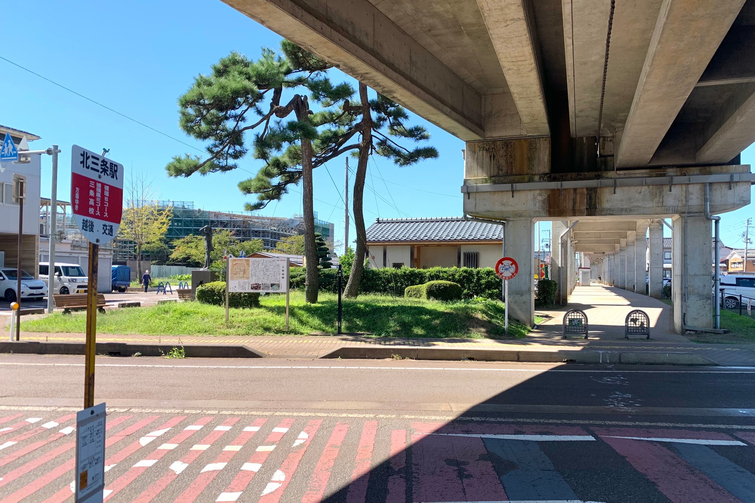 역 앞은 산조 성 터이며, 현지에는 안내판이 세워져 있다. 남서쪽은 중앙 시장(2·7의 시장)의 회장이 되고 있으며, 스테이지 엔가와와 2021년 현재 건설 중인 도서관을 핵심으로 한 복합 시설 등, 시의 도시 기능 집적이 진행되고 있다. 역에서 동서로 이어지는 고가 하부에는 보도가 정비되어 있다.