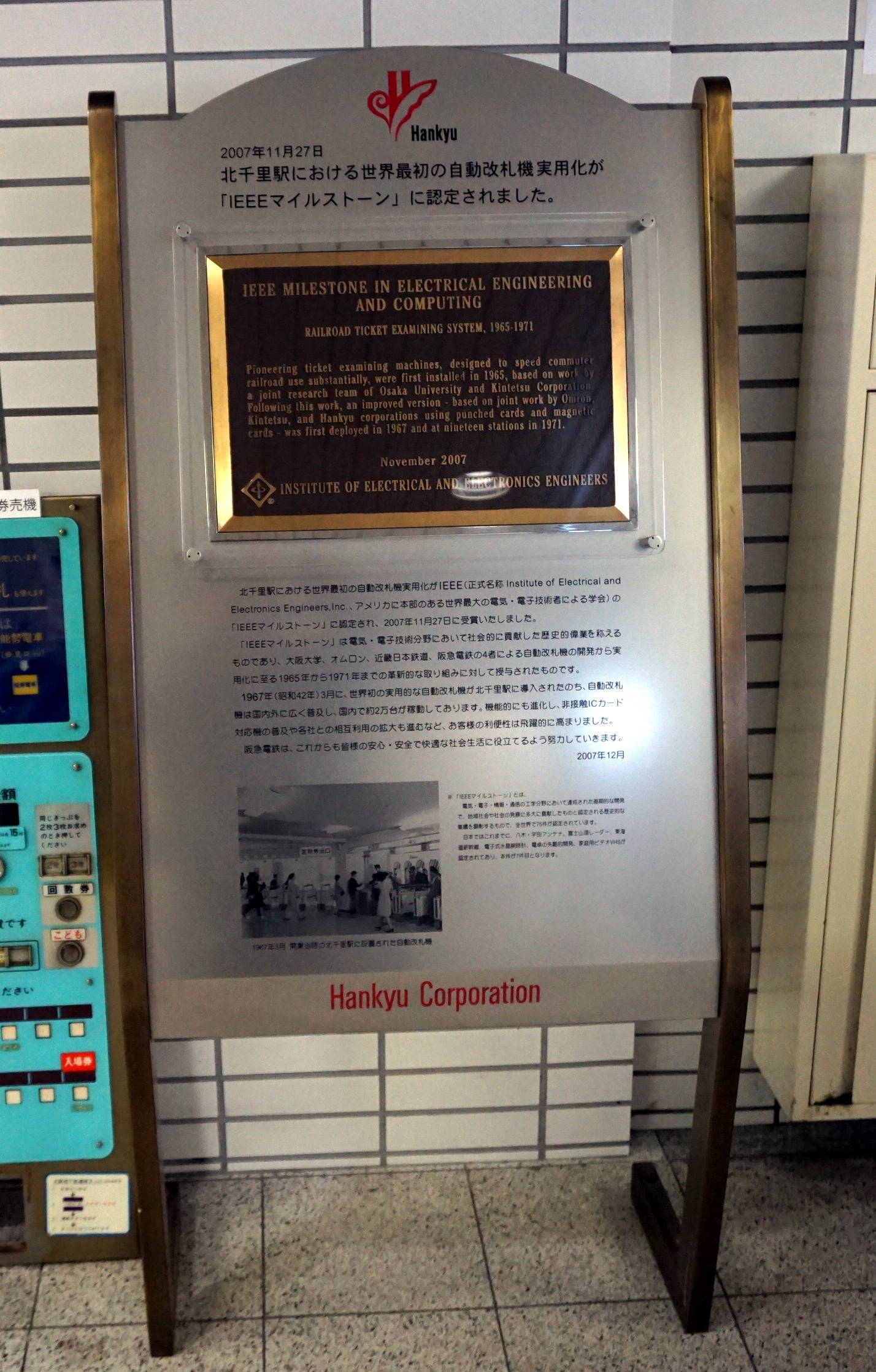 2007년 (헤이세이 19년) 11월 27일에는 철도용 자동 개찰 시스템의 개발·실용화와 관련하여, 전기·전자·정보·통신 분야에서 세계 최대의 학회인 IEEE(미국 전기 전자 학회)로부터 『IEEE 마일스톤』으로 인정받았다. 한큐는 오사카 대학, 오므론, 킨키 일본 철도와 함께 이 시스템을 공동으로 연구·개발하여 수상을 받았다.[8] 기타센리역 개찰구 부근에는 그 수상을 기념하는 명판이 설치되어 있다.[5]